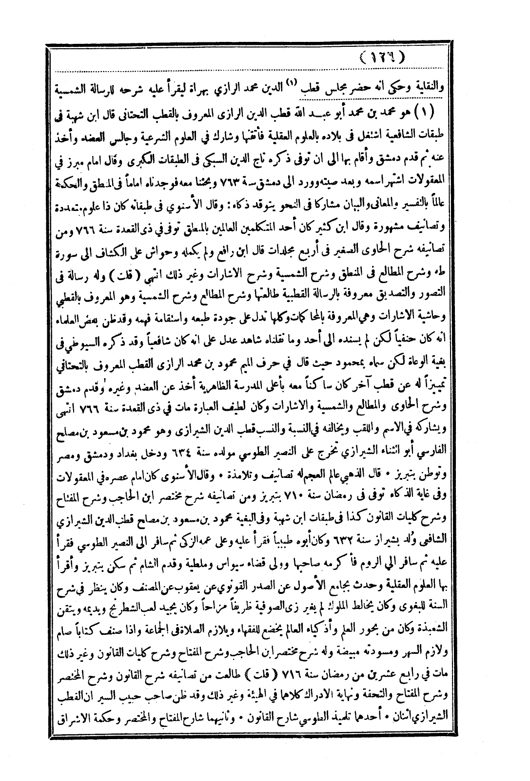 (¬1) هو محمد بن محمد أبو عبد الله قطب الدين الرازى المعروف بالقطب التحتانى قال ابن شهبة في طبقات الشافعية اشتغل في بلاده بالعلوم العقلية فأتقنها وشارك في العلوم الشرعية وجالس العضد وأخذ عنه ثم قدم دمشق وأقام بها إلى أن توفى ذكره تاج الدين السبكي فى الطبقات الكبرى وقال إمام مبرز في المعقولات اشتهر اسمه وبعد صيته وورد إلى دمشق سنة 763 وبحثنا معه فوجدناه إماماً في المنطق والحكمة عالماً بالتفسير والمعانى والبيان مشاركا في النحو يتوقد ذكاء: وقال الأسنوي في طبقاته كان ذا علوم متعددة وتصانيف مشهورة وقال ابن كثير كان أحد المتكلمين العالمين بالمنطق توفي في ذى القعدة سنة 766 ومن تصانيفه شرح الحاوي الصغير في أربع مجلدات قال ابن رافع ولم يكمله وحواش على الكشاف إلى سورة طه وشرح المطالع في المنطق وشرح الشمسية وشرح الإشارات وغير ذلك انتهى.