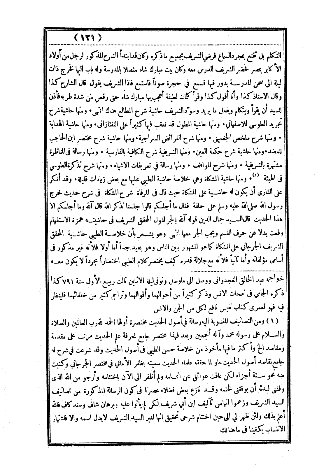 التكلم بل تقنع بمجرد السماع فرضي الشريف بجميع ما ذكره وكان قد ابتدأ الشرح المذكور لرجل من أولاد الأكابر بمصر فحضر الشريف الدرس معه وكان بيت مبارك شاه متصلا بالمدرسة وله باب إليها فخرج ذات ليلة إلى صحن المدرسة يدور فيها فسمع في حجرة صوتاً فاستمع فإذا الشريف يقول قال الشارح كذا وقال الأستاذ كذا وأنا أقول كذا وقرأ كلمات لطيفة أعجب بها مبارك شاه حتى رقص من شدة طربه فأذن للسيد أن يقرأ ويتكلم ويفعل ما يريد وسوّد الشريف حاشية شرح المطالع هناك انتهى * ومنها حاشية شرح تجريد الطوسي للأصفهاني * ومنها حاشية المطول قد تعقب فيها كثيراً علي التفتازاني * ومنها حاشية الهداية * ومنها شرح ملخص الجغمينى * ومنها شرح الفرائض السراجية. ومنها حاشية شرح مختصر ابن الحاجب للعضد. ومنها حاشية شرح حكمة العين * ومنها الشريفية شرح الكافية بالفارسية. ومنها رسالة في المناظرة مشتهرة بالشريفية * ومنها شرح المواقف * ومنها رسالة في تعريفات الأشياء. ومنها شرح تذكرة الطوسي في الهيئة (¬1) * ومنها حاشية المشكاة وهي خلاصة حاشية الطبي عليها مع بعض زيادات قليلة. وقد أنكر على القاري أن يكون له حاشية على المشكاة حيث قال في المرقاة شرح المشكاة في شرح حديث خرج رسول الله صلى الله عليه وسلم على حلقة فقال ما أجلسكم قالوا جلسنا نذكر الله قال آلله وما أجلكم إلا هذا الحديث قال السيد جمال الدين قوله آلله بالجر لقول المحقق الشريف في حاشيته همزة الاستفهام وقعت بدلا عن حرف القسم ويجب الجر معها انتهى وهو يشعر بأن خلاصة الطيبى حاشية المحقق الشريف الجرجاني على المشكاة كما هو المشهور بين الناس وهو بعيد جداً أما أولا فلأنه غير مذكور في أسامى مؤلفاته وأما ثانياً فلأنه مع جلالة قدره كيف يختصر كلام الطيبي اختصاراً مجرداً لا يكون معه