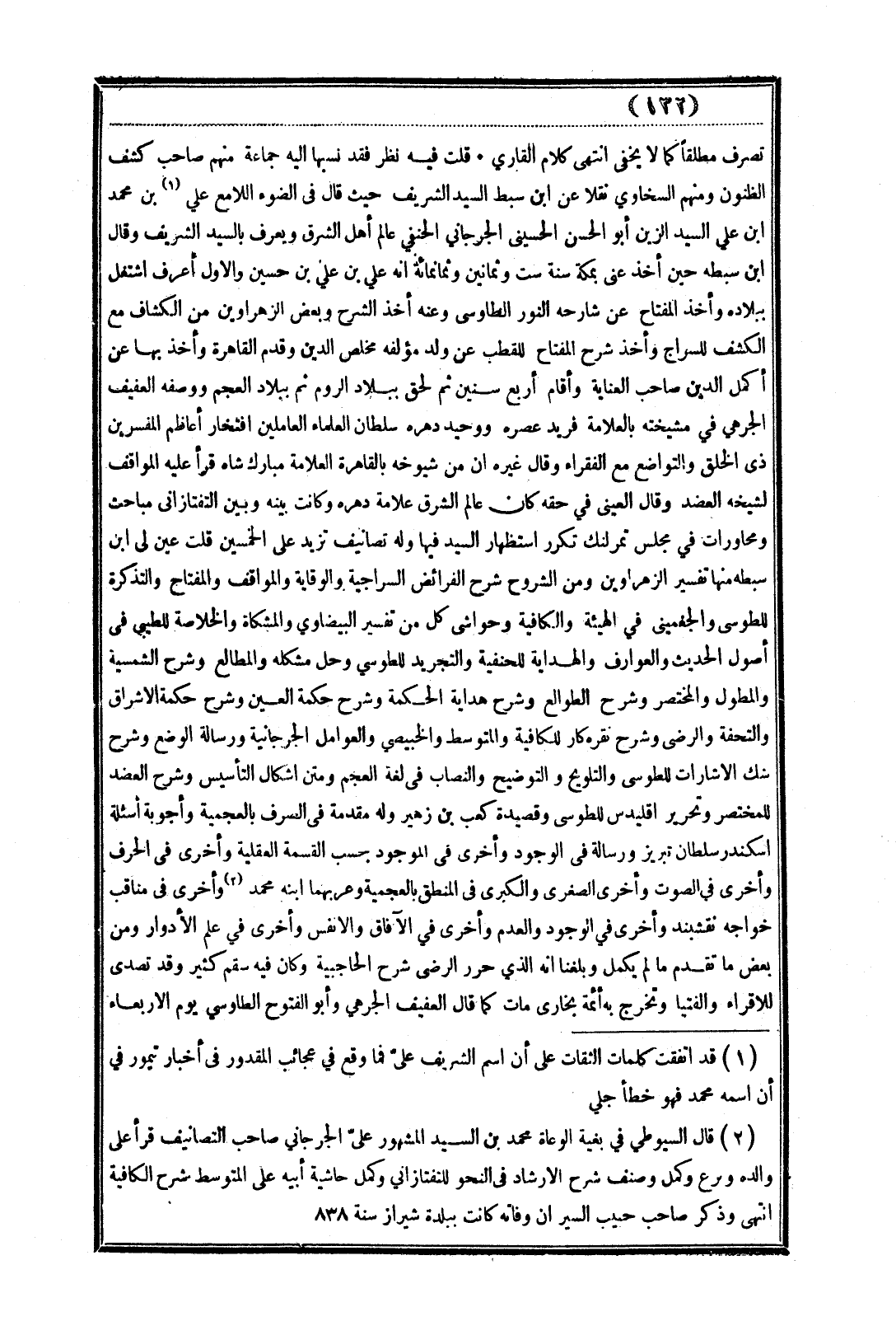 (¬2) قال السيوطي في بغية الوعاة محمد بن السيد المشهور عليّ الجرجاني صاحب التصانيف قرأ على والده وبرع وكمل وصنف شرح الإرشاد في النحو للتفتازاني وكل حاشية أبيه على المتوسط شرح الكافية انتهى وذكر صاحب حبيب السير أن وفاته كانت ببلدة شيراز سنة 838.