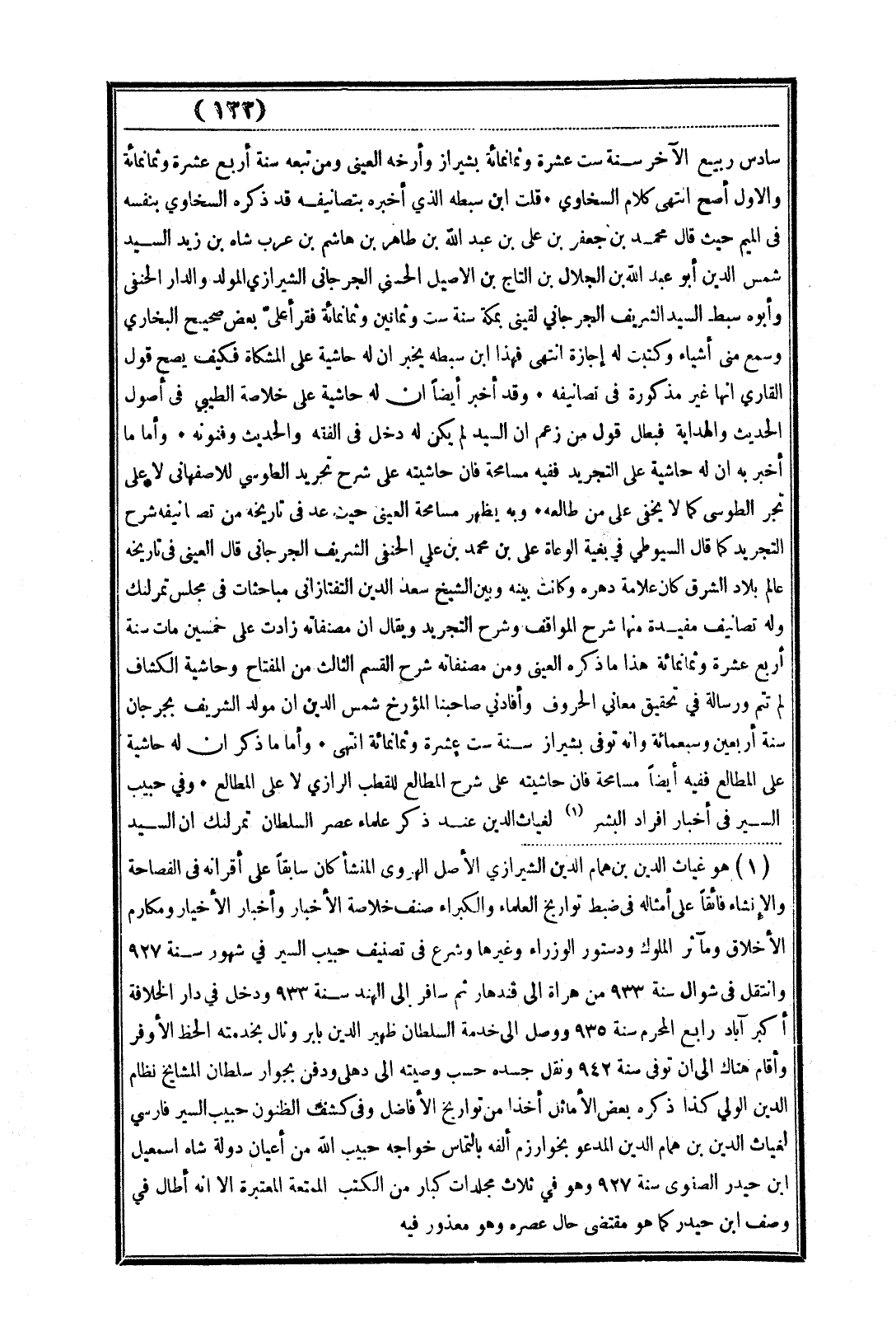سادس ربيع الآخر سنة ست عشرة وثمانمائة بشيراز وأرخه العيني ومن تبعه سنة أربع عشرة وثمانمائة والأول أصح انتهى كلام السخاوي * قلت ابن سبطه الذي أخبره بتصانيفه قد ذكره السخاوي بنفسه في الميم حيث قال محمد بن جعفر بن علي بن عبد الله بن طاهر بن هاشم بن عرب شاه بن زيد السيد شمس الدين أبو عبد الله بن الجلال بن التاج بن الأصيل الحسني الجرجانى الشيرازي المولد والدار الحنفي وأبوه سبط السيد الشريف الجرجاني لقينى بمكة سنة ست وثمانين وثمانمائة فقرأ على بعض صحيح البخاري وسمع مني أشياء وكتبت به إجازة انتهى فهذا ابن سبطه يخبر أن له حاشية علي المشكاة فكيف يصح قول القاري أنها غير مذكورة في تصانيفه * وقد أخبر أيضاً أن له حاشية على خلاصة الطيبي في أصول الحديث والهداية فبطل قول من زعم أن السيد لم يكن له دخل في الفقه والحديث وفنونه * وأما ما أخبر به أن له حاشية على التجريد ففيه مسامحة فإن حاشيته على شرح تجريد الطوسي للأصفهاني لا على تجر الطوسي كما لا يخفى على من طالعه * وبه يظهر مسامحة العيني حيث عد في تاريخه من تصانيفه شرح التجريد كما قال السيوطي في بغية الوعاة على بن محمد بن علي الحنفي الشريف الجرجانى قال العينى في تاريخه عالم بلاد الشرق كان علامة دهره وكانت بينه وبين الشيخ سعد الدين التفتازانى مباحثات في مجلس تمرلنك وله تصانيف مفيدة منها شرح المواقف وشرح التجريد ويقال أن مصنفاته زادت على خمسين مات سنة أربع عشرة وثمانمائة هذا ما ذكره العينى ومن مصنفاته شرح القسم الثالث من المفتاح وحاشية الكشاف لم تتم ورسالة في تحقيق معاني الحروف وأفادني صاحبنا المؤرخ شمس الدين أن مولد الشريف بجرجان سنة أربعين وسبعمائة وأنه توفي بشيراز سنة ست عشرة وثمانمائة انتهى * وأما ما ذكر أن له حاشية على المطالع ففيه أيضاً مسامحة فإن حاشيته على شرح المطالع للقطب الرازي لا على المطالع * وفي حبيب السير في أخبار أفراد البشر (¬1) لغياث الدين عند ذكر علماء عصر السلطان تمرلنك أن السيد
