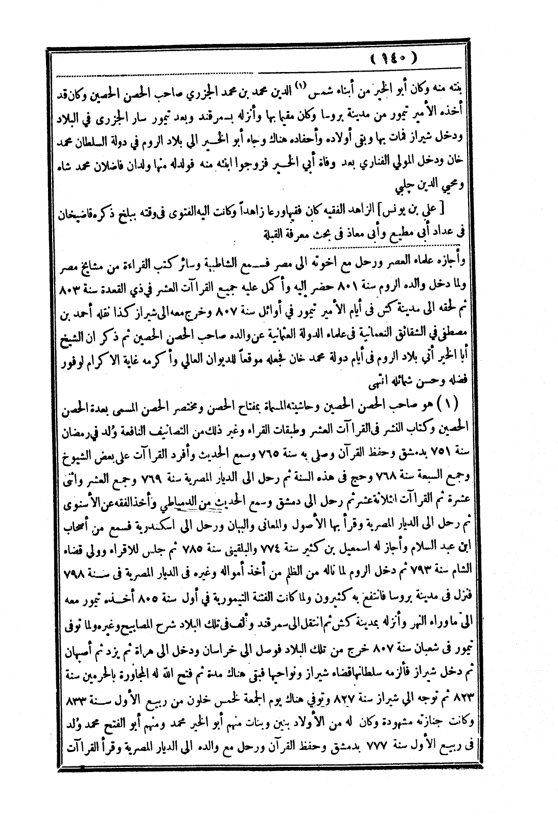 (¬1) هو صاحب الحصن الحصين وحاشيته المسماة بمفتاح الحصن ومختصر الحصن المسمى بعدة الحصن الحصين وكتاب النشر في القراآت العشر وطبقات القراء وغير ذلك من التصانيف النافعة وُلد في رمضان سنة 751 بدمشق وحفظ القرآن وصلى به سنة 765 وسمع الحديث وأفرد القراآت علي بعض الشيوخ وجمع السبعة سنة 768 وحج في هذه السنة ثم رحل إلى الديار المصرية سنة 769 وجمع العشر واثني عشرة ثم القراآت الثلاثة عشر ثم رحل إلى دمشق وسمع الحديث من الدمياطي وأخذ الفقه عن الأسنوي رحل إلى الديار المصرية وقرأ بها الأصول والمعاني والبيان ورحل إلى إسكندرية فسمع من أصحاب ابن عبد السلام وأجاز له إسماعيل بن كثير سنة 774 والبلقيني سنة 785 ثم جلس للاقراء وولي قضاء الشام سنة 793 ثم دخل الروم لما ناله من الظلم من أخذ أمواله وغيره في الديار المصرية في سنة 798 فنزل في مدينة بروسا فانتفع به كثيرون ولما كانت الفتنة التيمورية في أول سنة 805 أخذه تيمور معه إلى ما وراء النهر وأنزله بمدينة كش ثم انتقل إلى سمرقند وألف في تلك البلاد شرح المصابيح وغيره ولما توفي تيمور في شعبان سنة 807 خرج من تلك البلاد فوصل إلى خراسان ودخل إلى هراة ثم يزد ثم أصبهان ثم دخل شيراز فألزمه سلطانها قضاء شيراز ونواحيها فبقي هناك مدة ثم فتح الله له المجاورة بالحرمين سنة 823 ثم توجه إلى شيراز سنة 827 وتوفي هناك يوم الجمعة لخمس خلون من ربيع الأول سنة 833 وكانت جنازته مشهودة وكان له من الأولاد بنين وبنات منهم أبو الخير محمد ومنهم أبو الفتح محمد وُلد في ربيع الأول سنة 777 بدمشق وحفظ القرآن ورحل مع والده إلى الديار المصرية وقرأ القراآت =