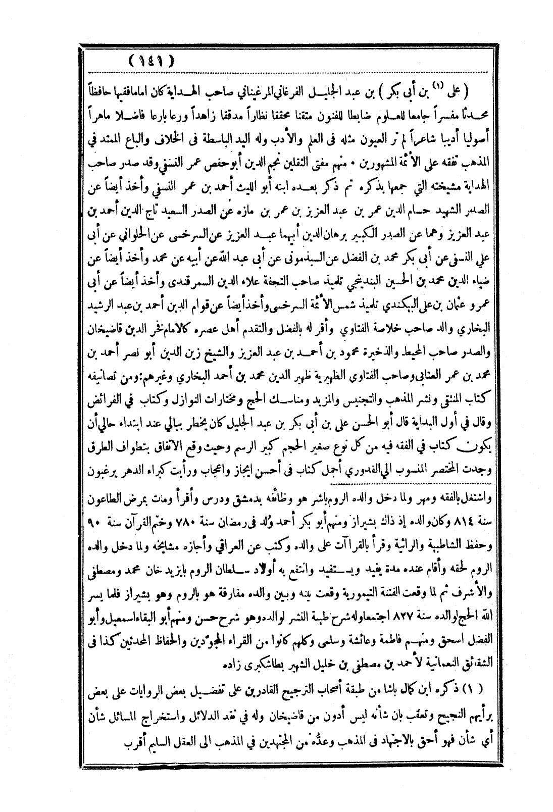 (علي (¬1) بن أبي بكر) بن عبد الجليل الفرغاني المرغيناني صاحب الهداية كان إماما فقيها حافظًا محدثا مفسراً جامعا للعلوم ضابطا للفنون متقنا محققا نظراً مدققا زاهداً ورعا بارعا فاضلا ماهراً أصوليا أديبا شاعراً لم تر العيون مثله في العلم والأدب وله اليد الباسطة في الخلاف والباع الممتد في المذهب تفقه على الأئمة المشهورين. منهم مفتي الثقلين نجم الدين أبو حفص عمر النسفي وقد صدر صاحب الهداية مشيخته التي جمعها بذكره ثم ذكر بعده ابنه أبو الليث أحمد بن عمر النسفي وأخذ أيضاً عن الصدر الشهيد حسام الدين عمر بن عبد العزيز بن عمر بن مازه عن الصدر السعيد تاج الدين أحمد بن عبد العزيز وهما عن الصدر الكبير برهان الدين أيهما عبد العزيز عن السرخسى عن الحلواني عن أبي علي النسفي عن أبي بكر محمد بن الفضل عن السبذمولى عن أبي عبد الله عن أبيه عن محمد وأخذ أيضاً عن ضياء الدين محمد بن الحسين البنديخي تلميذ صاحب التحفة علاء الدين السمرقندى وأخذ أيضاً عن أبي عمرو عثمان بن علي البيكندي تلميذ شمس الأئمة السرخسى وأخذ أيضاً عن قوام الدين أحمد بن عبد الرشيد البخاري والد صاحب خلاصة الفتاوي وأقر له بالفضل والتقدم أهل عصره كالإمام فخر الدين قاضيخان والصدر صاحب المحيط والذخيرة محمود بن أحمد بن عبد العزيز والشيخ زبان الدين أبو نصر أحمد بن محمد بن عمر العتابي وصاحب الفتاوي الظهيرية ظهير الدين محمد بن أحمد البخاري وغيرهم: ومن تصانيفه كتاب المنتقى ونشر المذهب والتجنيس والمزيد ومناسك الحج ومختارات النوازل وكتاب في الفرائض وقال في أول البداية قال أبو الحسن على أن أبي بكر بن عبد الجليل كان يخطر ببالي عند ابتداء حالي أن يكون كتاب في الفقه فيه من كل نوع صغير الحجم كبير الرسم وحيث وقع الاتفاق بتطواف الطرق وجدت المختصر المنسوب إلى القدوري أجمل كتاب في أحسن إيجاز وإعجاب ورأيت كبراء الدهر يرغبون