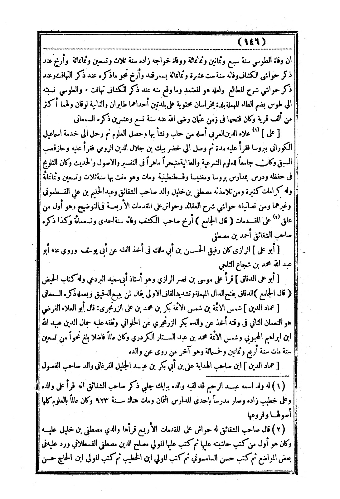 (¬2) قال صاحب الشقائق له حواش على المقدمات الأربع قرأها والدي مصطفى بن خليل عليه وكان هو أول من كتب حاشيته عليها ثم كتب عليها المولي مصلح الدين مصطفى القسطلاني ورد عليه في بعض المواضع ثم كتب حسن السامسوني ثم كتب المولي ابن الخطيب ثم كتب المولى ابن الحاج حسن =