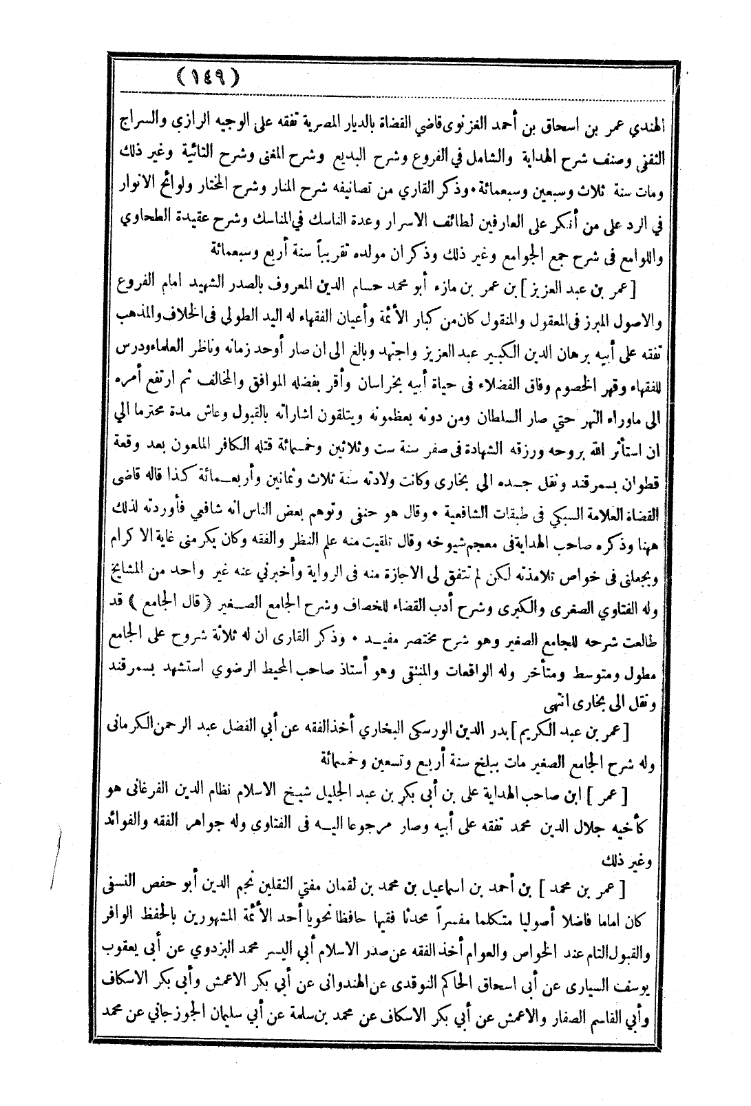 [عمر بن محمد] بن أحمد بن إسماعيل بن محمد بن لقمان مفتي الثقلين نجم الدين أبو حفص النسفي كان إمامًا فاضلًا أصوليا متكلما مفسرًا محدثا فقيها حافظا نحويا أحد الأئمة المشهورين بالحفظ الوافر والقبول التام عند الخواص والعوام أخذ الفقه عن صدر الإسلام أبي اليسر محمد البزدوي عن أبى يعقوب يوسف السيارى عن أبى إسحاق الحاكم النوقدى عن الهندوانى عن أبي بكر الأعمش وأبى بكر الاسكاف وأبي القاسم الصفار والأعمش عن أبي بكر الاسكاف عن محمد بن سلمة عن أبي سليمان الجوزجاني عن محمد