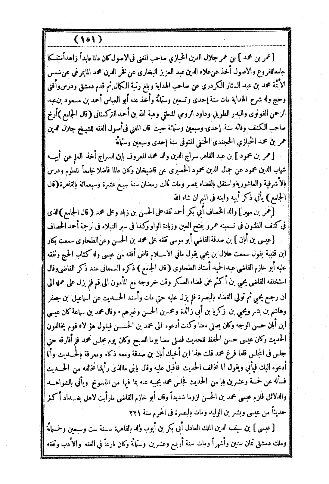 (قال الجامع) أرخ صاحب الكشف وفاته سنة إحدى وسبعين وستمائة حيث قال المغني في أصول الفقه للشيخ جلال الدين عمر بن محمد الخبازي الخجندى الحنفي المتوفى سنة إحدى وسبعين وستمائة.