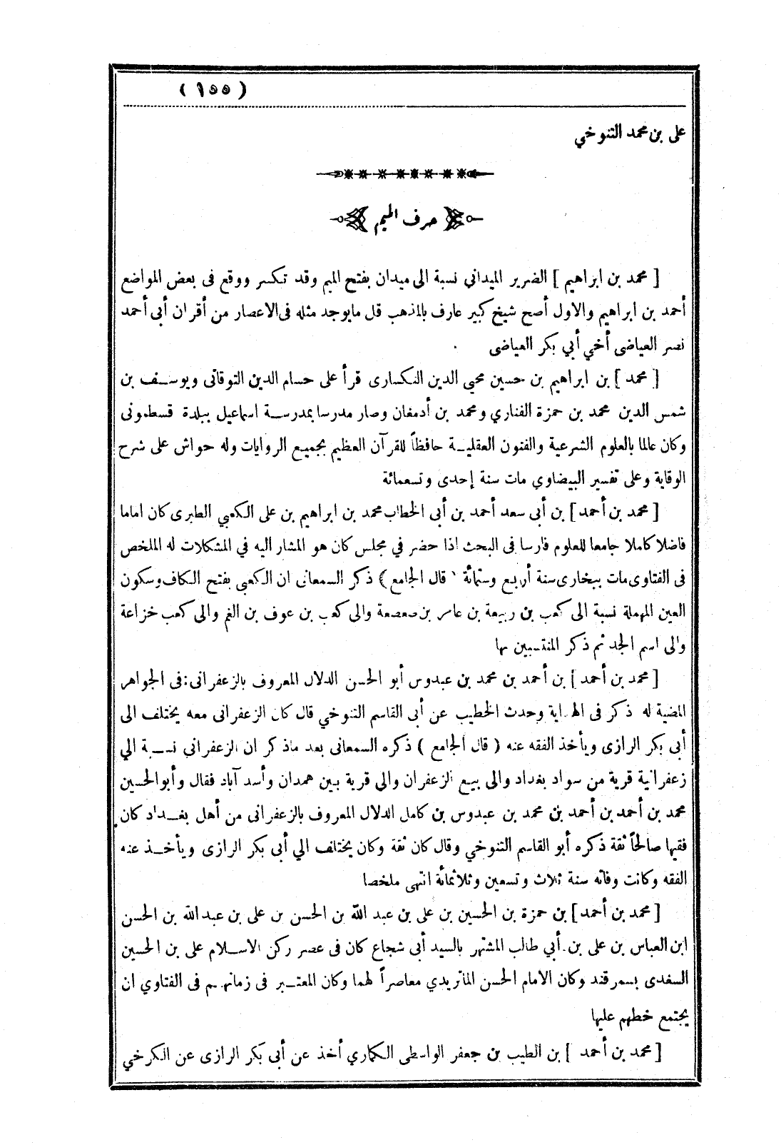 [محمد بن إبراهيم] الضرير الميداني نسبة إلى ميدان بفتح الميم وقد تكسر ووقع في بعض المواضع أحمد بن إبراهيم والأول أصح شيخ كبير عارف بالمذهب قل ما يوجد مثله في الأعصار من أقران أبي أحمد نصر العياضى أخي أبي بكر العياضي.