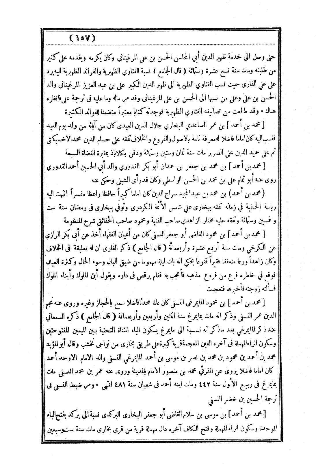 (محمد بن أحمد) بن محمد بن عبد المجيد سراج الدين كان إمامًا كبيراً حافظا واعظا مفسراً انتهت إليه رياسة الحنفية في زمانه تفقه ببخارى علي شمس الأئمة الكردرى وتوفي ببخارى في رمضان سنة ست وخمسين وستمائة وتفقه عليه مختار الزاهدى صاحب القنية ومحمود صاحب الحقائق شرح المنظومة.