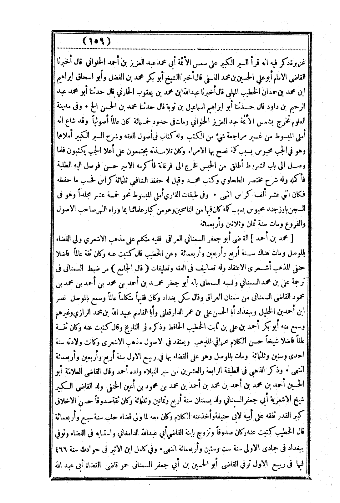 (قال الجامع) مر ضبط السمعانى في ترجمة على بن محمد السمعاني ونسبه السمعانى بأنه أبو جعفر محمد بن أحمد بن محمد بن أحمد بن محمد بن محمود القاضى السمعانى من سمعان العراق وقال سكن بغداد وكان فقيهاً متكلماً عالماً وسمع بالموصل نصر ابن أحمد بن الخليل وببغداد أبا الحسن على أن عمر الدارقطنى وأبا القاسم عبيد الله بن محمد الرازي وغيرهم وسمع منه أبو بكر أحمد بن علي بن ثابت الخطيب الحافط وذكره فى التاريخ وقال كتبت عنه وكان ثقة عالماً فاضلا شيخاً حسن الكلام عراقي المذهب ويعتقد في الأصول مذهب الأشعري وكانت ولادته سنة إحدى وستين وثلثمائة ومات بالموصل وهو على القضاء بها في ربيع الأول سنة أربع وأربعين وأربعمائة انتهى. وذكر الذهبى في الطبقة الرابعة والعشرين من سير النبلاء ولده أحمد وقال القاضى العلامة أبو الحسين أحمد بن محمد بن أحمد بن محمد بن أحمد بن محمد بن محمود بن أعين الحنفى ولد القاضى الكبير شيخ الأشعرية أبي جعفر السمناني ولد بسمنان سنة أربع وثمانين وثلثمائة وكان ثقة صدوقاً حسن الأخلاق كبير القدر تفقه على أبيه لابي حنيفة وأخذ عنه الكلام وكان معه لما ولى قضاء حلب سنة سبع وأربعمائة قال الخطيب كتبت عنه ركن صدوقاً وتزوج بابنة القاضي أبي عبد الله الدامغاني واستابه في القضاء وتوفي ببغداد في جمادى الأولى سنة ست وستين وأربعمائة انتهى. وفي كامل ابن الأثير في حوادث سنة 466 فيها فى ربيع الأول توفي القاضى أبو الحسين بن أبي جعفر السمعانى حمو قاضى القضاة أبى عبد الله