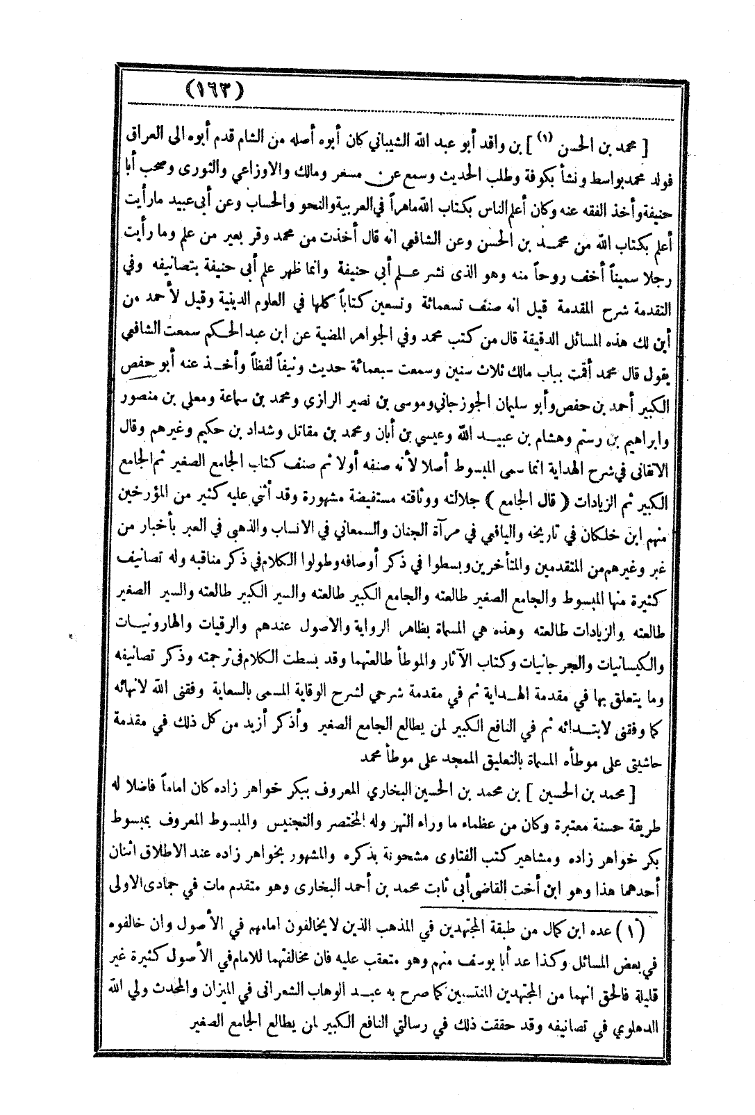 [محمد بن الحسن (¬1)] بن واقد أبو عبد الله الشيباني كان أبوه أصله من الشام قدم أبوه إلى العراق فولد محمد بواسط ونشأ بكوفة وطلب الحديث وسمع عن مسعر ومالك والأوزاعي والثورى وصاحب أبا حنيفة وأخذ الفقه عنه وكان أعلم الناس بكتاب الله ماهرًا في العربية والنحو والحساب وعن أبي عبيد ما رأيت أعلم بكتاب الله من محمد بن الحسن وعن الشافعي أنه قال أخذت من محمد وقر بعير من علم وما رأيت رجلا سمينًا أخف روحًا منه وهو الذي نشر علم أبي حنيفة وإنما ظهر علم أبي حنيفة بتصانيفه وفي التقدمة شرح المقدمة قيل أنه صنف تسعمائة وتسعين كتابًا كلها في العلوم الدينية وقيل لأحمد من أين لك هذه المسائل الدقيقة قال من كتب محمد وفي الجواهر المضية عن ابن عبد الحكم سمعت الشافعي يقول قال محمد أقمت بباب مالك ثلاث سنين وسمعت سبعمائة حديث ونيفًا لفظًا وأخذ عنه أبو حفص الكبير أحمد بن حفص وأبو سلميان الجوزجاني وموسى بن نصير الرازي ومحمد بن ساعة ومعلى بن منصور وإبراهيم بن رستم وهشام بن عبيد الله وعيسى بن أبان ومحمد بن مقاتل وشداد بن حكيم وغيرهم وقال الاتقانى في شرح الهداية إنما سمى المبسوط أصلا لأنه صنفه أولا ثم صنف كتاب الجامع الصغير ثم الجامع الكبير ثم الزيادات.