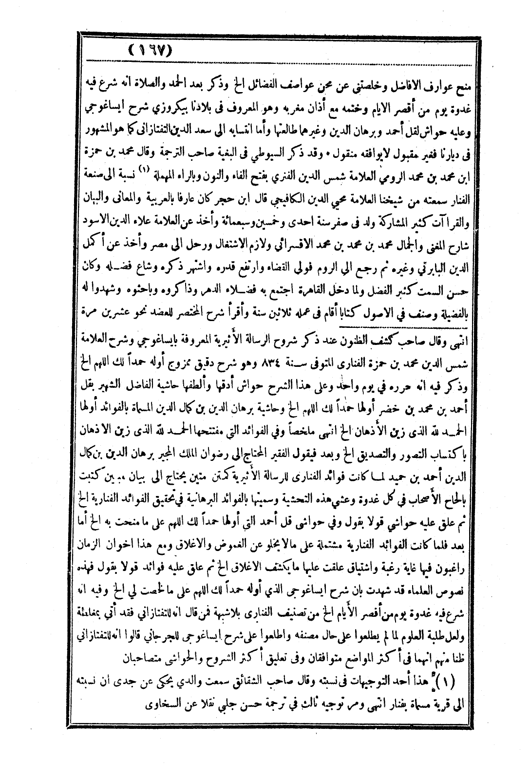 = انتهى وقال صاحب كشف الظنون عند ذكر شروح الرسالة الأثيرية المعروفة بإيساغوجي وشرح العلامة شمس الدين محمد بن حمزة الفنارى المتوفى سنة 834 وهو شرح دقيق ممزوج أوله حمدًا لك اللهم الخ وذكر فيه أنه حرره في يوم واحد وعلى هذا الشرح حواش أدقها وألطفها حاشية الفاضل الشهير بقل أحمد بن محمد بن خضر أولها حمدًا لك اللهم الخ وحاشية برهان الدين بن كل الدين المسماة بالفوائد أولها الحمد لله الذى زين الأذهان الخ انتهى ملخصًا وفي الفوائد التي مفتتحها الحمد لله الذى زين الأذهان باكتساب التصور والتصديق الخ وبعد فيقول الفقير المحتاج إلى رضوان الملك المجير برهان الدين بن كمال الدين أحمد بن حميد لما كانت فوائد الفنارى للرسالة الأثيرية كمتن متين يحتاج إلى بيان مبين كتبت بالحاح الأصحاب في كل غدوة وعشي هذه التحشية وسميتها بالفوائد البرهانية في تحقيق الفوائد الفنارية الخ ثم علق عليه حواشي قولا بقول وفي حواشى قل أحمد التي أولها حمدًا لك اللهم على ما منحت به الخ أما بعد فلما كانت الفوائد الفنارية مشتملة على ما لا يخلو عن الغموض والإغلاق ومع هذا اخوان الزمان راغبون فيها غاية رغبة واشتياق علقت عليها ما يكشف الاغلاق الخ ثم علق عليه فوائد قولا بقول فهذه نصوص العلماء قد شهدت بأن شرح إيساغوجى الذي أوله حمدًا لك اللهم على ما لخصت لي الخ وفيه أنه شرع فيه غدوة يوم من أقصر الأيام الخ من تصنيف الفنارى بلا شبهة فمن قال أن للتفتازاني فقد أتي بمغلطة ولعل طلبة العلوم لما لم يطلعوا على حال مصنفه وأطلعوا على شرح ايساغوجى للجرجاني قالوا أن للتفتازاني ظنا منهم أنهما في أكثر المواضع متوافقان وفي تعليق أكثر الشروح والحواشى متصاحبان.