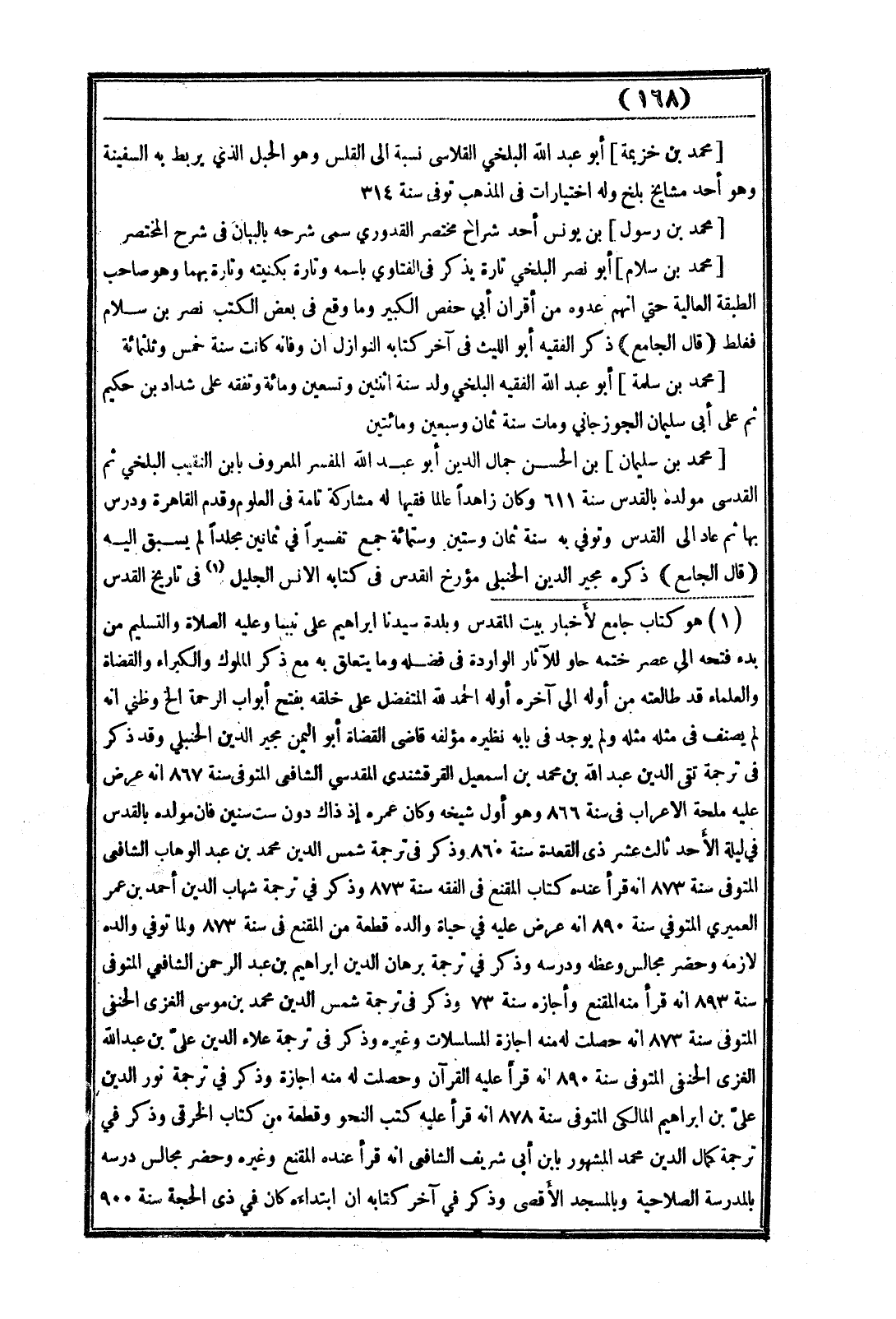 (¬1) هو كتاب جامع لأخبار بيت المقدس وبلدة سيدنا إبراهيم على نبينا وعليه الصلاة والتسليم من بدء فتحه إلى عصر ختمه حاو للآثار الواردة فى فضله وما يتعلق به مع ذكر الملوك والكبراء والقضاة والعلماء قد طالعته من أوله إلى آخره أوله الحمد لله المتفضل على خلقه بفتح أبواب الرحمة الخ وظني أنه لم يصنف في مثله مثله ولم يوجد في بابه نظيره مؤلفه قاضى القضاة أبو اليمن مجير الدين الحنبلي وقد ذكر فى ترجمة تقي الدين عبد الله بن محمد بن إسماعيل القرقشندى المقدسي الشافعى المتوفى سنة 867 أنه عرض عليه ملحة الاعراب في سنة 866 وهو أول شيخه وكان عمره إذ ذاك دون ست سنين فإن مولده بالقدس في ليلة الأحد ثالث عشر ذى القعدة سنة 860 وذكر ترجمة شمس الدين محمد بن عبد الوهاب الشافعى المتوفى سنة 873 أنه قرأ عنده كتاب المقنع فى الفقه سنة 873 وذكر في ترجمة شهاب الدين أحمد بن عمر العميري المتوفى سنة 890 أنه عرض عليه في حياة والده قطعة من المقنع في سنة 873 ولما توفي والده لازمه وحضر مجالس وعظه ودرسه وذكر في ترجمة برهان الدين إبراهيم بن عبد الرحمن الشافعي المتوفى سنة 893 أنه قرأ منه المقنع وأجازه سنة 73 وذكر ترجمة شمس الدين محمد بن موسى الغزى الحنفى المتوفى سنة 873 أنه حصلت له منه إجازة المسلسلات وغيره وذكر في ترجمة علاء الدين عليّ بن عبد الله الغزى الحنفى المتوفى سنة 890 أنه قرأ عليه القرآن وحصلت له منه إجازة وذكر في ترجمة نور الدين عليّ بن إبراهيم المالكى المتوفى سنة 878 أنه قرأ عليه كتب النحو وقطعة من كتاب الخرقى وذكر في ترجمة كمال الدين محمد المشهور بإبن أبي شريف الشافعى أنه قرأ عنده المقنع وغيره وحضر مجالس درسه بالمدرسة الصلاحية وبالمسجد الأقصى وذكر في آخر كتابه أن ابتداءه كان في ذى الحجة سنة 900