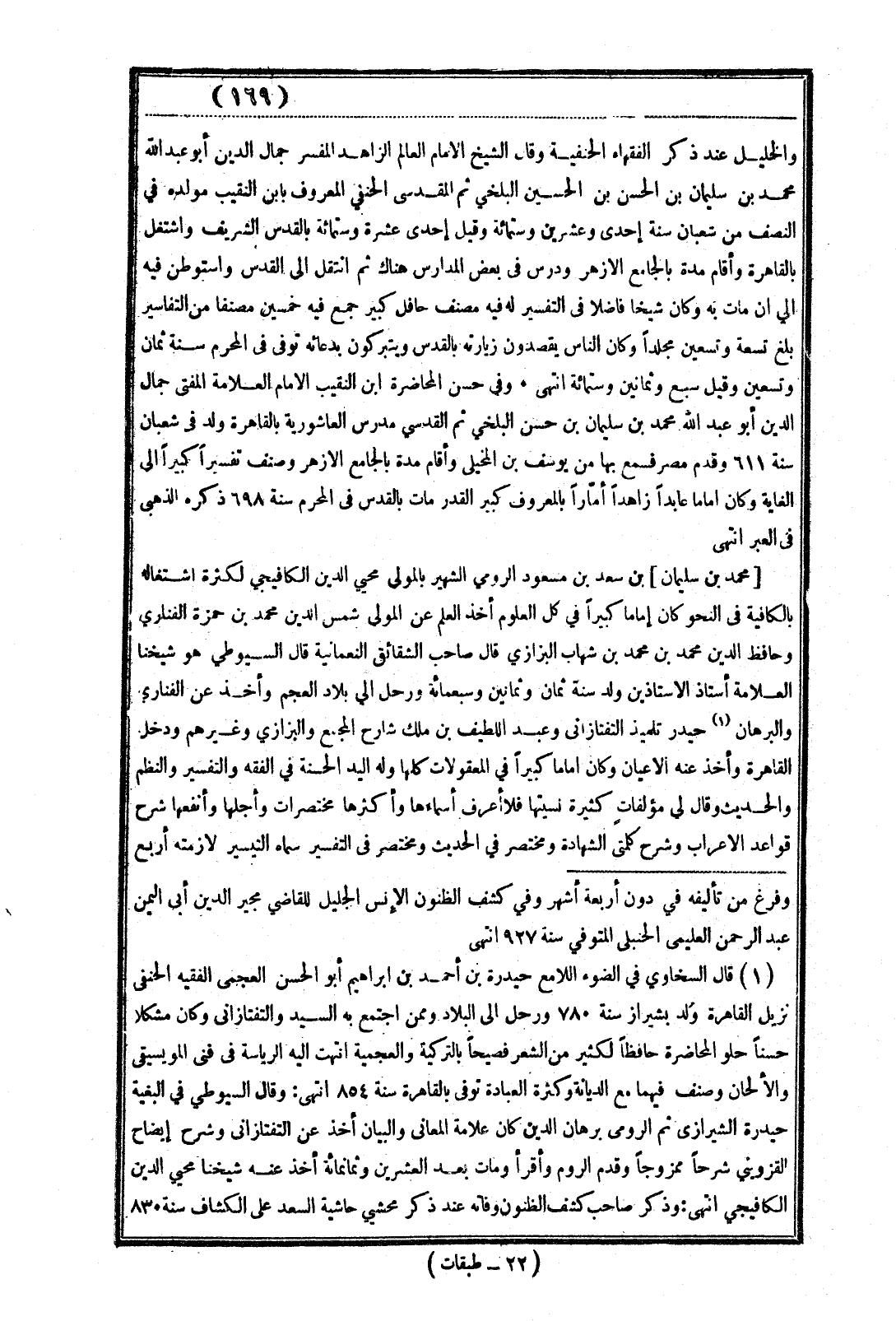 والخليل عند ذكر الفقهاء الحنفية وقال الشيخ الإمام العالم الزاهد المفسر جمال الدين أبو عبد الله محمد بن سليمان بن الحسن بن الحسين البلخي ثم المقدسى الحنفي المعروف بابن النقيب مولده في النصف من شعبان سنة إحدى وعشرين وستمائة وقيل إحدى عشرة وستمائة بالقدس الشريف واشتغل بالقاهرة وأقام مدة بالجامع الأزهر ودرس في بعض المدارس هناك ثم انتقل إلى القدس واستوطن فيه إلى أن مات به وكان شيخا فاضلا في التفسير له فيه مصنف حافل كبير جمع فيه خمسين مصنفا من التفاسير بلغ تسعة وتسعين مجلدًا وكان الناس يقصدون زيارته بالقدس ويتبركون بدعائه توفي في المحرم سنة ثمان وتسعين وقيل سبع وثمانين وستمائة انتهى. وفي حسن المحاضرة ابن النقيب الإمام العلامة المفتى جمال الدين أو عبد الله محمد بن سليمان بن حسن البلخي ثم القدسي مدرس العاشورية بالقاهرة ولد في شعبان سنة 611 وقدم مصر فسمع بها من يوسف بن المخيلى وأقام مدة بالجامع الأزهر وصنف تفسيرًا كبيرًا إلى الغاية وكان إمامًا عابدًا زاهدًا أمارًا بالمعروف كبير القدر مات بالقدس فى المحرم سنة 698 ذكره الذهبى في العبر انتهى.