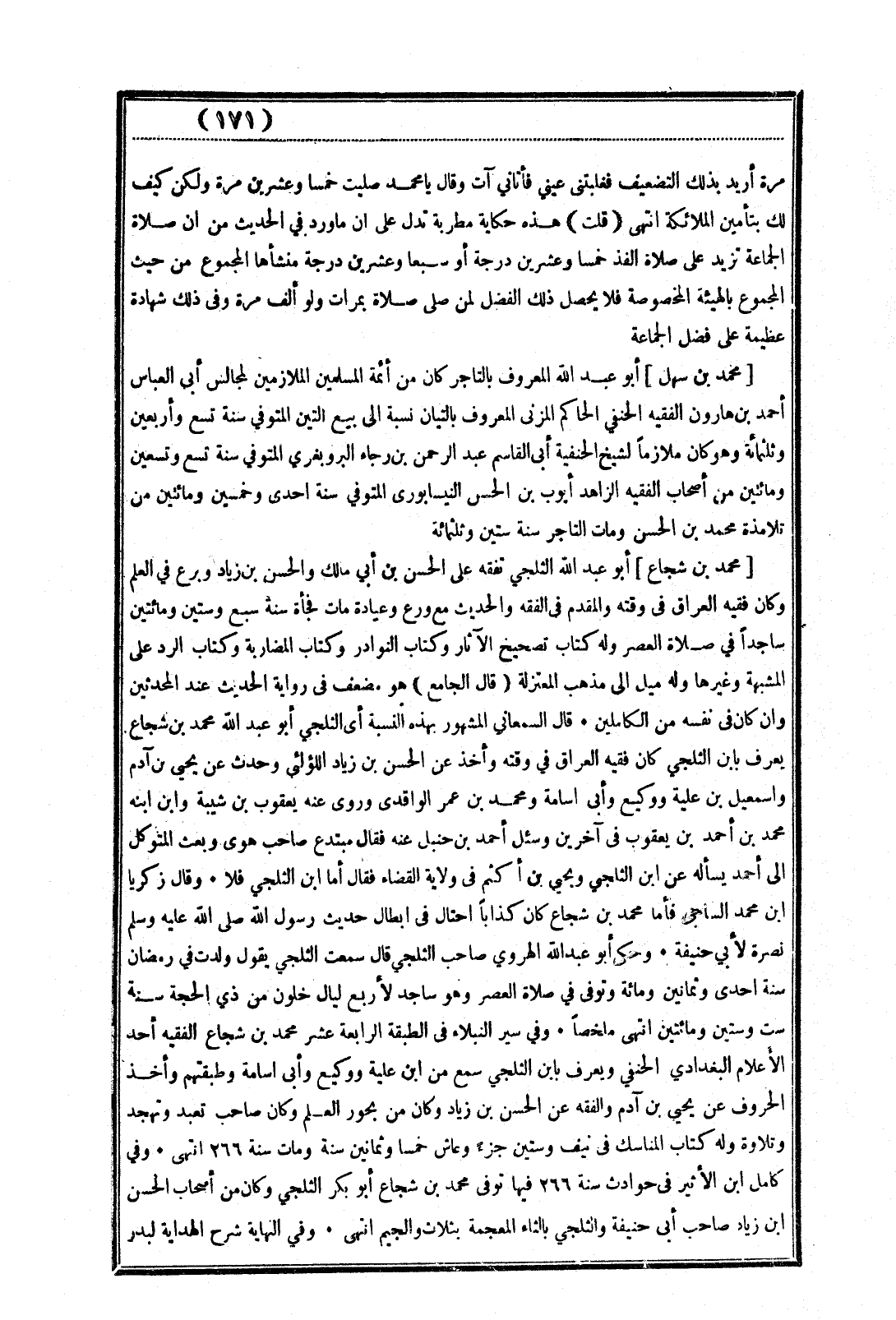 [محمد بن شجاع] أبو عبد الله الثلجي تفقه على الحسن بن أبي مالك والحسن بن زياد وبرع في العلم وكان فقيه العراق في وقته والمقدم في الفقه والحديث مع ورع وعيادة مات فجأة سنة سبع وستين ومائتين ساجداً في صلاة العصر وله كتاب تصحيح الآثار وكتاب النوادر وكتاب المضاربة وكتاب الرد على المشبهة وغيرها وله ميل إلى مذهب المعتزلة.