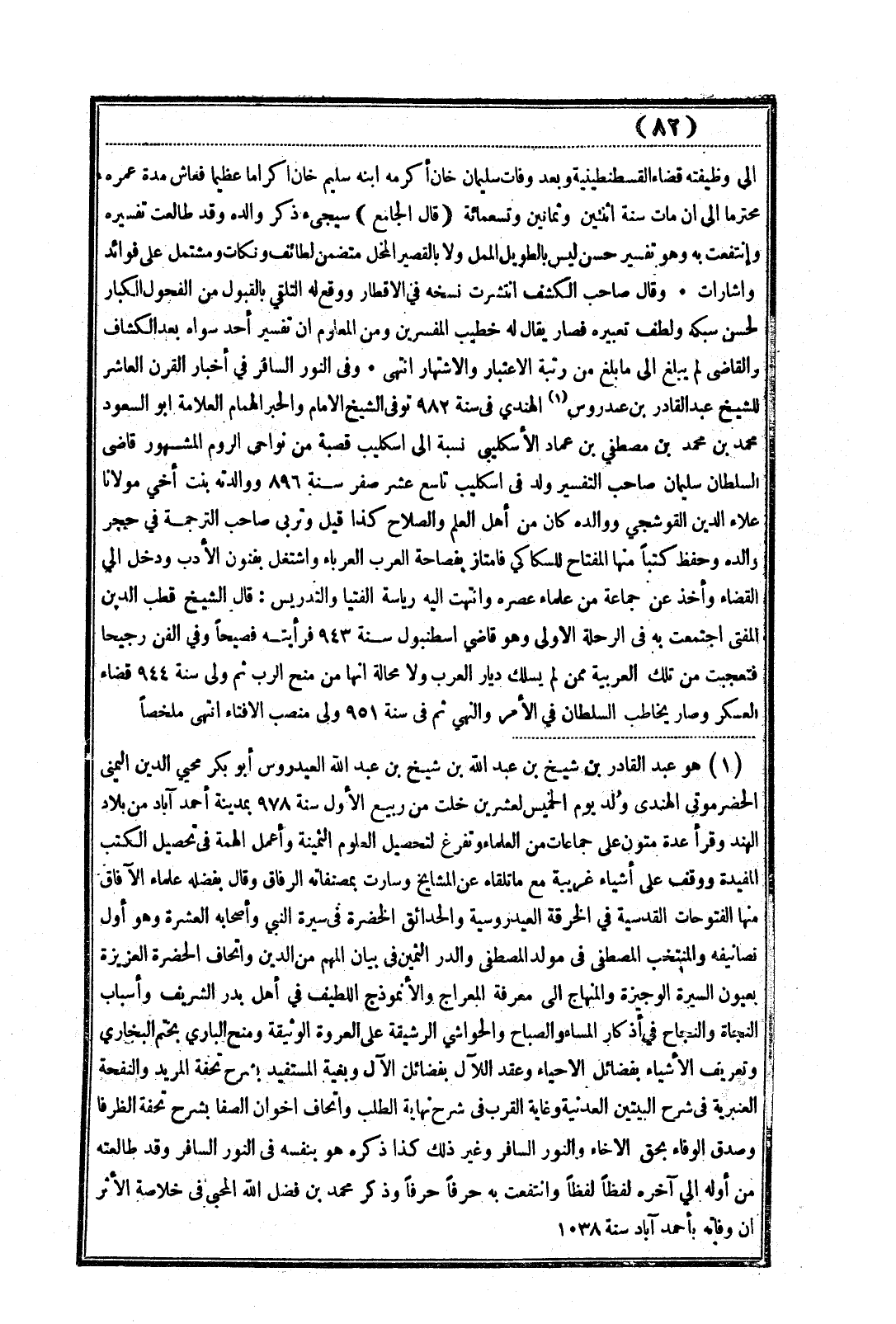 (¬1) هو عبد القادر بن شيخ بن عبد الله بن شيخ بن عبد الله العيدروس أبو بكر محيي الدين اليمني الحضرموتي الهندى وُلد يوم الخميس لعشرين خلت من ربيع الأول سنة 978 بمدينة أحمد آباد من بلاد الهند وقرأ عدة متون على جماعات من العلماء وتفرغ لتحصيل العلوم الثمينة وأعمل الهمة في تحصيل الكتب المفيدة ووقف على أشياء غريبة مع ما تلقاه عن المشايخ وسارت بمصنفاته الرفاق وقال بفضله علماء الآفاق منها الفتوحات القدسية في الخرقة العيدروسية والحدائق الخضرة في سيرة النبي وأصحابه العشرة وهو أول تصانيفه والمنتخب المصطفى في مولد المصطفى والدر الثمين في بيان المهم من الدين وإتحاف الحضرة العزيزة بعيون السيرة الوجيزة والمنهاج إلى معرفة المعراج والأنموذج اللطيف في أهل بدر الشريف وأسباب النجاة والنجاح في أذكار المساء والصباح والحواشي الرشيقة على العروة الوثيقة ومنح الباري بختم البخاري وتعريف الأشياء بفضائل الاحياء وعقد اللآل بفضائل الآل وبغية المستفيد بشرح تحفة المريد والنفحة العنبرية في شرح البيتين العدنية وغاية القرب في شرح نهاية الطلب وإتحاف إخوان الصفا بشرح تحفة الظرفا وصدق الوفاء بحق الإخاء والنور السافر وغير ذلك كذا ذكره هو بنفسه في النور السافر وقد طالعته من أوله إلى آخره لفظًا لفظًا وانتفعت به حرفًا حرفًا وذكر محمد بن فضل الله المحبي في خلاصة الأثر أن وفاته بأحمد آباد سنة 1038.