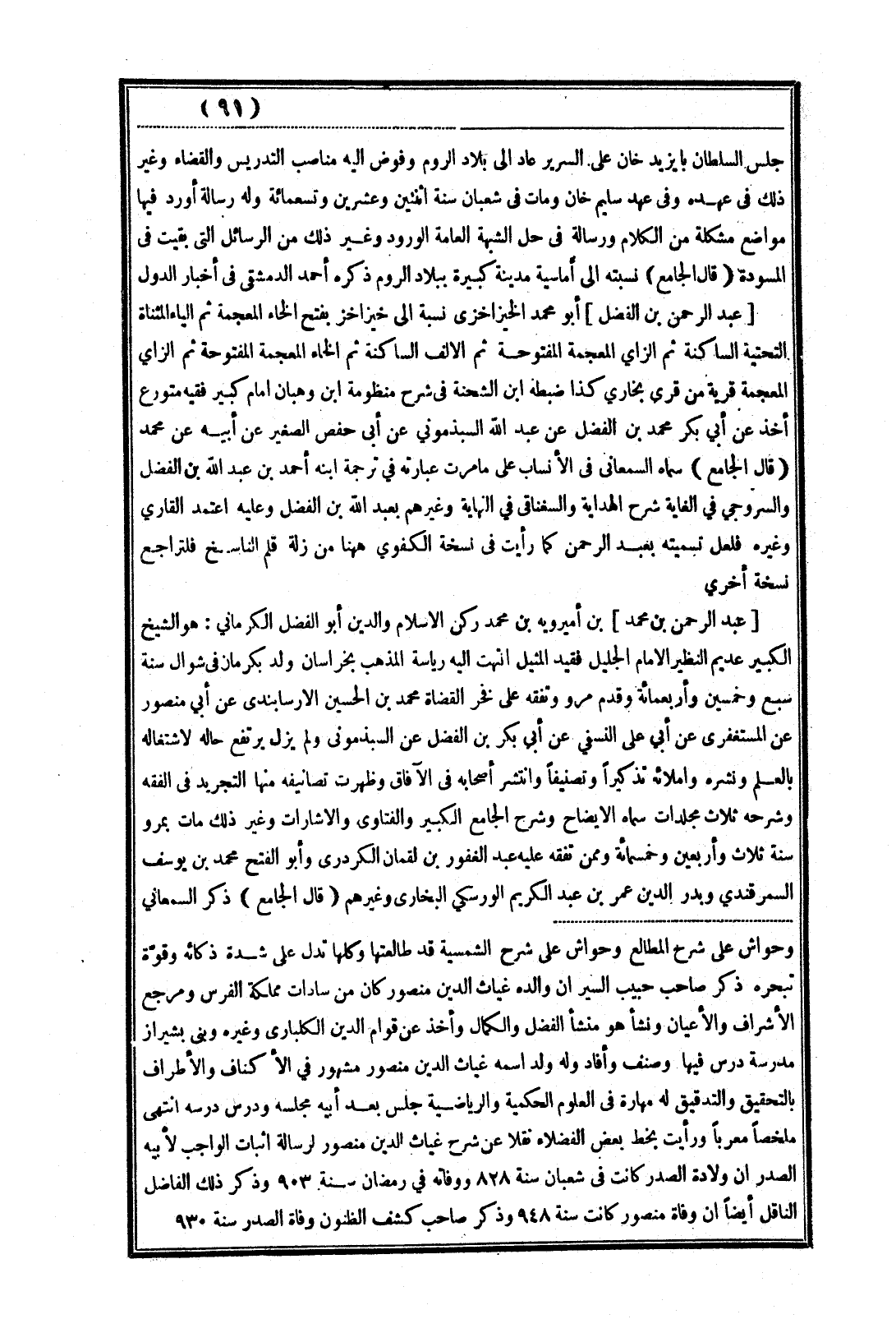 = وحواش على شرح المطالع وحواش على شرح الشمسية قد طلعتها وكلها تدل على شدة ذكائه وقوة تبحره ذكر صاحب حبيب السير أن والده غياث الدين منصور كان من سادات مملكة الفرس ومرجع الأشراف والأعيان ونشأ هو ومنشأ الفضل والكمال وأخذ عن قوام الدين الكلبارى وغيره وبنى بشيراز مدرسة درس فيها وصنف وأفاد وله ولد اسمه غياث الدين منصور مشهور في الأكناف والأطراف بالتحقيق والتدقيق له مهارة في العلوم الحكمية والرياضية جلس بعد أبيه مجلسه ودرس درسه انتهى ملخصاً معرباً ورأيت بخط بعض الفضلاء نقلا عن شرح غياث الدين منصور لرسالة اثبات الواجب لأبيه الصدر أن ولادة الصدر كانت في شعبان سنة 828 ووفاته في رمضان سنة 903 وذكر ذلك الفاضل الناقل أيضاً أن وفاة منصور كانت سنة 948 وذكر صاحب كشف الظنون وفاة الصدر سنة 930.