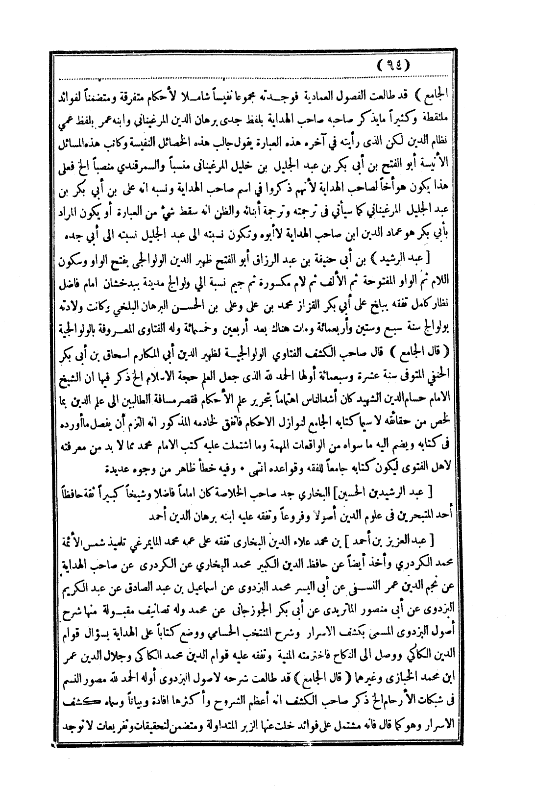 الجامع) قد طلعت الفصول العمادية فوجدته مجموعا نفيساً شاملا لأحكام متفرقة ومتضمناً لفوائد ملتقطة وكثيراً ما يذكر صاحبه صاحب الهداية بلفظ جدي برهان الدين المرغيناني وابنه عمر بلفظ عمي نظام الدين لكن الذى رأيته في آخره هذه العبارة يقول جالب هذه الخصائل النفيسة وكاتب هذه المسائل الأنيسة أبو الفتح بن أبي بكر بن عبد الجليل بن خليل المرغينانى منسباً والسمرقندي منصباً ألخ فعلى هذا يكون هو أخاً لصاحب الهداية لأنهم ذكروا في اسم صاحب الهداية ونسبه أنه على بن أبي بكر بن عبد الجليل المرغيناني كما سيأتي في ترجمته وترجمة أبنائه والظن أنه سقط في من العبارة أو يكون المراد بأبي بكر هو عماد الدين ابن صاحب الهداية لأبوه وتكون نسبته إلى عبد الجليل نسبته إلى أبي جده.