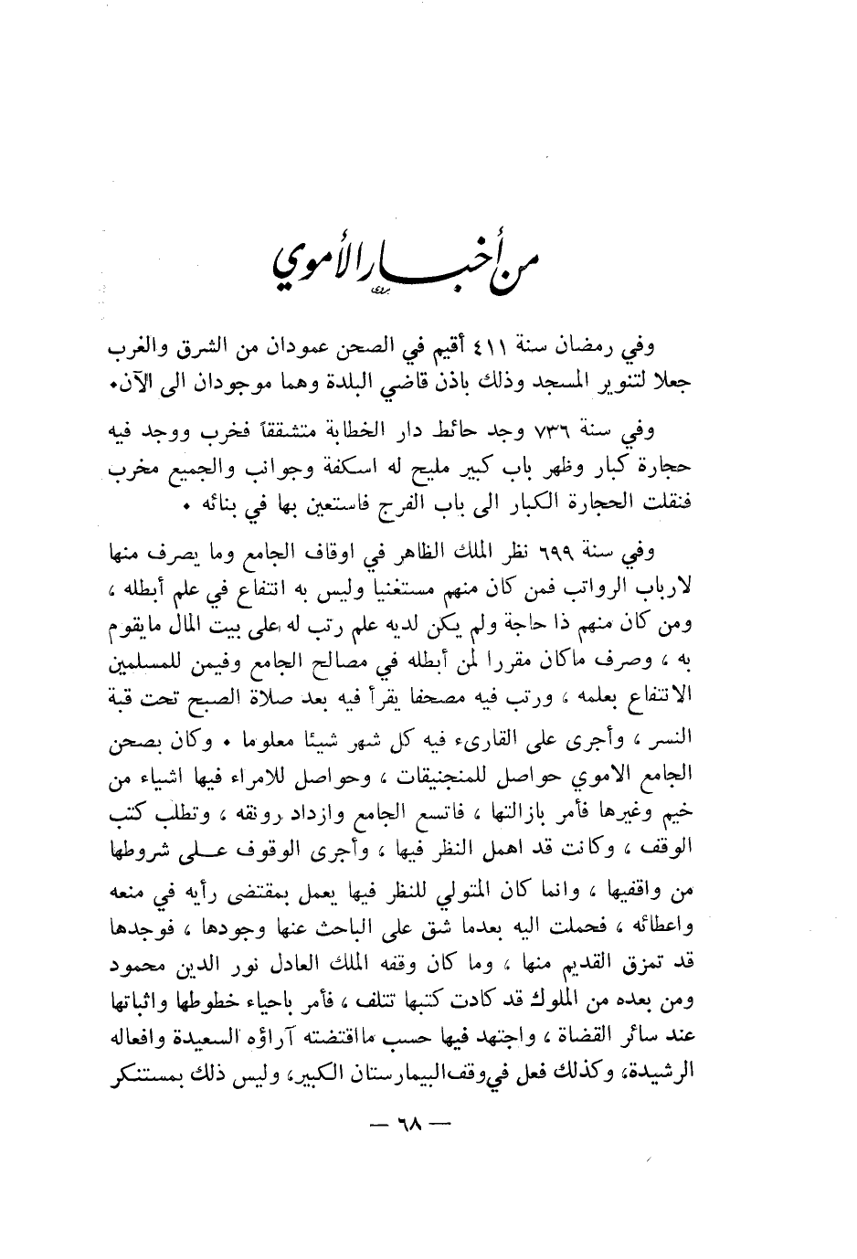 وفي سنة 736 وُجد حائط دار الخطابة متشقّقاً فخرب، ووُجد فيه حجارة كبار، وظهر باب كبير مليح له (أسكفّة) وجوانب، والجميع مخرب، فنُقلت الحجارة الكبار إلى باب الفرج فاستُعين بها في بنائه، وفي سنة 699 نظر الملك الظاهر في أوقاف الجامع وما يُصرف منها لأرباب الرواتب، فمن كان منهم مستغنياً وليس به انتفاع في علمٍ أبطله، ومن كان منهم ذا حاجة ولم يكن لديه علم رَتّب له على بيت المال ما يقوم به، وصرف ما كان مقرّراً لمن أبطله في مصالح الجامع، وفيمن للمسلمين الانتفاع بعلمه، ورتّب فيه مصحفاً يُقرأ فيه بعد صلاة الصبح تحت قبه النسر، وأجرى على القارئ فيه كل شهر شيئاً معلوماً. وكان بصحن الجامع الأموي حواصل للمنجنيقات وحواصل للأمراء، فيها أشياء من خيم وغيرها فأمر بإزالتها، فاتسع الجامع وازداد رونقه، وتطلّب كتب الوقف، وكانت قد أُهمل النظر فيها، وأجرى الوقوف على شروطها من واقفيها، وإنما كان المتولّي للنظر فيها يعمل بمقتضى رأيه في منعه وإعطائه، فحُملت إليه بعدما شقّ على الباحث عنها وجودّها، فوجدها قد تمزّق القديم منها، وما كان وقفه الملك العادل نور الدين محمود ومَن بعده من الملوك قد كادت كتبها تتلف، فأمر بإحياء خطوطها وإثباتها عند سائر القضاة، واجتهد فيها حسب ما اقتضته آراؤه السعيدة وأفعاله الرشيدة، وكذلك فعل في وقف البيمارستان الكبير، وليس ذلك بمستنكر