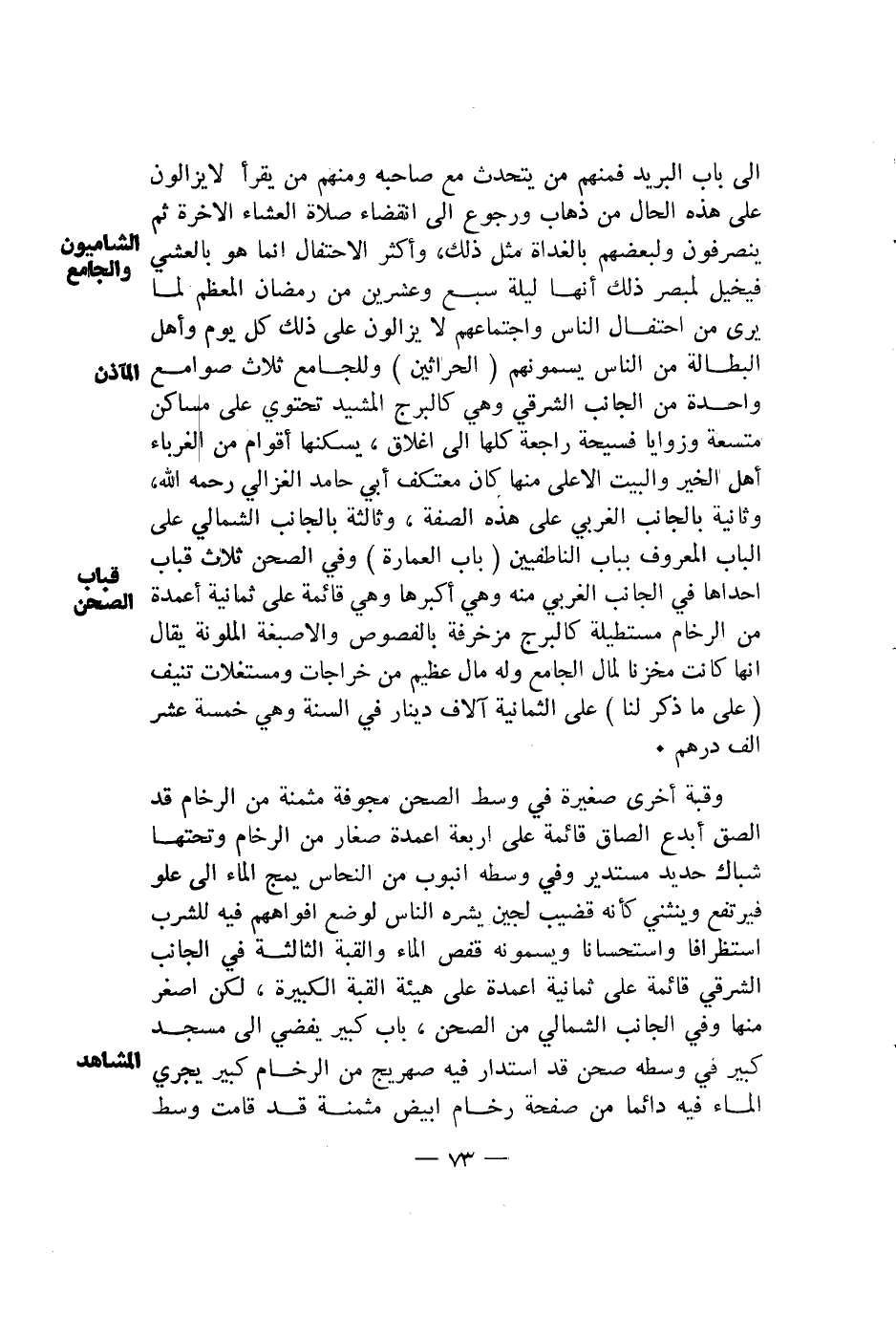 إلى باب البريد، فمنهم من يتحدث مع صاحبه، ومنهم من يقرأ، لا يزالون على هذه الحال من ذهاب ورجوع إلى انقضاء صلاة العشاء الآخرة، ثم ينصرفون ولبعضهم بالغداة مثل ذلك، (الشاميون والجامع) وأكثر الاحتفال إنما هو بالعشي، فيخيّل لمبصر ذلك أنها ليلة سبع وعشرين من رمضان المعظم، لما يرى من احتفال الناس واجتماعهم، لا يزالون على ذلك كل يوم، وأهل البطالة من الناس يسمونهم (الحرائين). (المآذن) وللجامع ثلاث صوامع، واحدة من الجانب الشرقي، وهي كالبرج المشيّد تحتوي على مساكن متسعة وزوايا فسيحة راجعة كلها إلى إغلاق، يسكنها أقوام من الغرباء أهل الخير، والبيت الأعلى منها كان معتكف أبي حامد الغزالي رحمه الله، وثانية بالجانب الغربي على هذه الصفة، وثالثة بالجانب الشمالي على الباب المعروف بباب الناطفيين (باب العمارة). (قباب الصحن) وفي الصحن ثلاث قباب، إحداها في الجانب الغربي منه وهي أكبرها، وهي قائمة على ثمانية أعمدة من الرخام، مستطيلة كالبرج، مزخرفة بالفصوص والأصبغة الملونة، يقال إنها كانت مخزناً لمال الجامع، وله مال عظيم من خراجات ومستغلاّت تنيف (على ما ذُكر لنا) على الثمانية آلاف دينار في السنة وهي خمسة عشر ألف درهم.