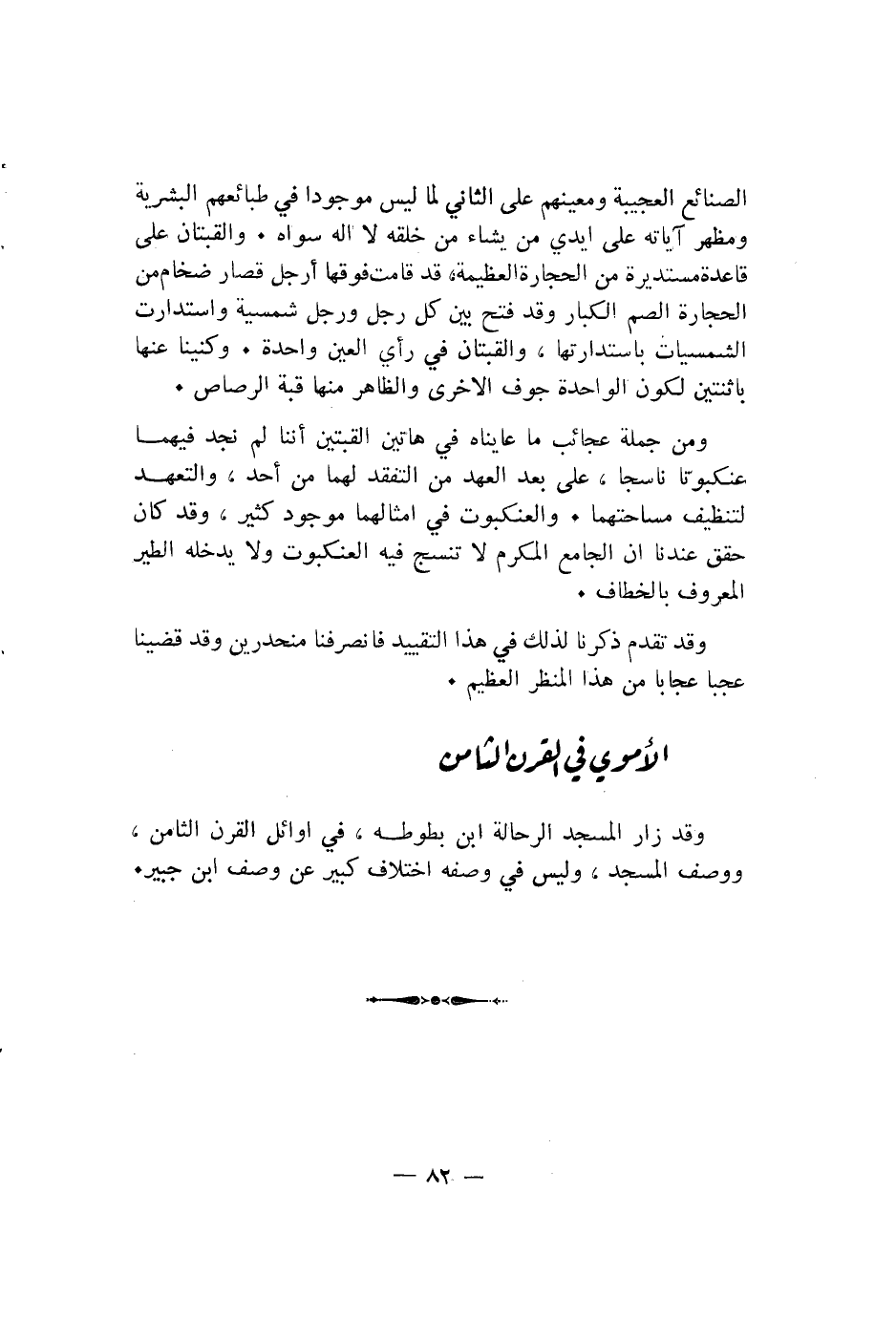 ومن جملة عجائب ما عاينّاه في هاتين القبتين أننا لم نجد فيهما عنكبوتاً ناسجاً، على بعد العهد من التفقّد لهما من أحد، والتعهد لتنظيف مساحتهما. والعنكبوت في أمثالهما موجود كثير، وقد كان حقق عندنا أن الجامع المكرم لا تُنسج فيه العنكبوت ولا يدخله الطير المعروف بالخطاف.