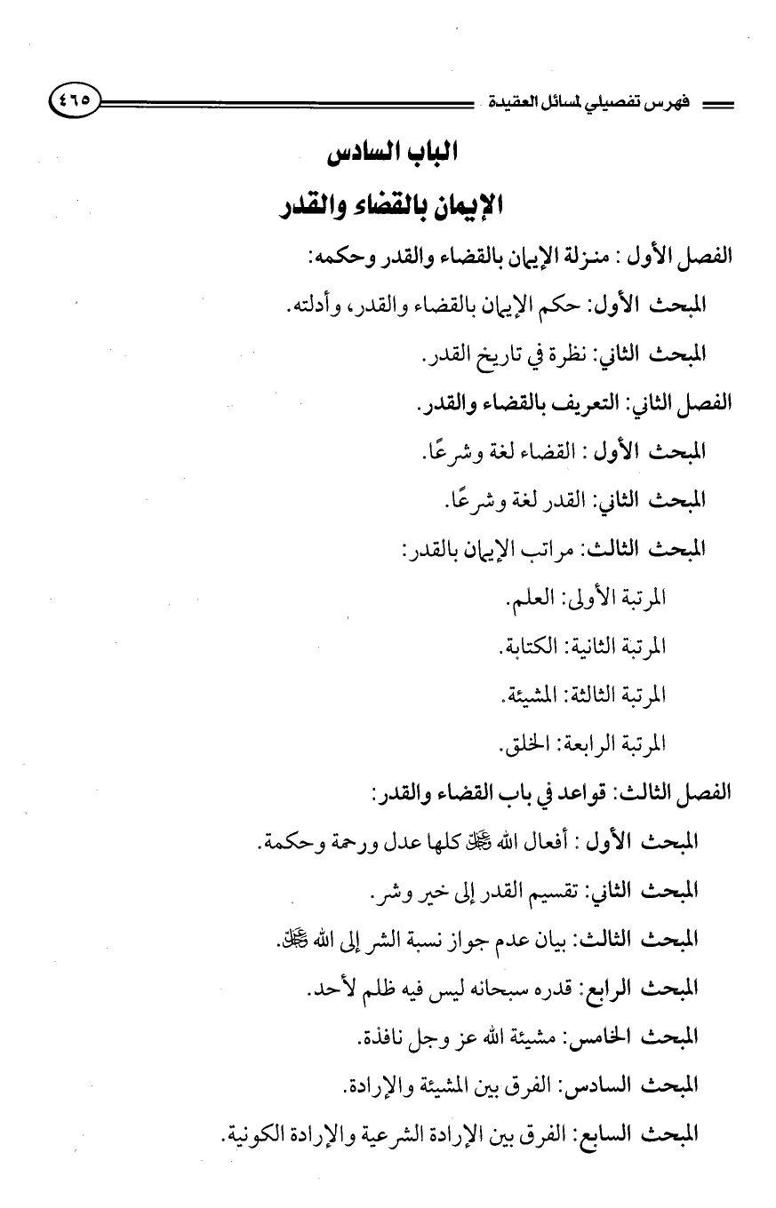 9- القدر وما يتعلق به من علم الله تعالى وشموله، وحديث احتجاج آدم على موسى والهدى والضلال، وتقدير آجال الخلق.