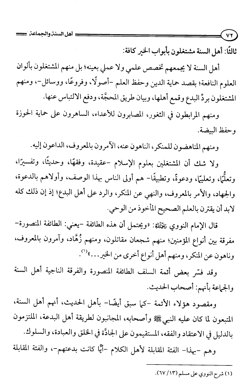 ولا يعني التزامهم بالسنة وإنكارهم على المخالف الخروج عن الطاعة أو مفارقة الجماعة، بل الأمر بالمعروف والنهي مع لزوم الجماعة، والانقياد لها بالطاعة هو منهج أهل الحق، أهل السنة والجماعة.
