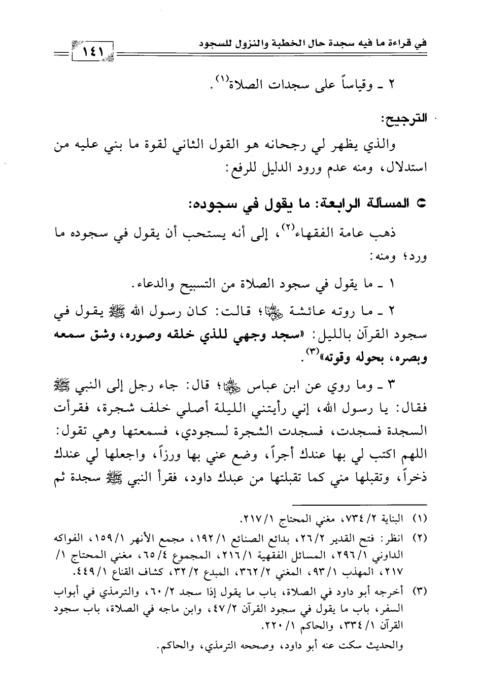 (¬3) أخرجه أبو داود في الصلاة، باب ما يقول إذا سجد (2/ 60) والترمذي في أبواب السفر، باب ما يقول في سجود القرآن (2/ 47) وابن ماجه في الصلاة، باب سجود القرآن (1/ 334) والحاكم (1/ 220).
