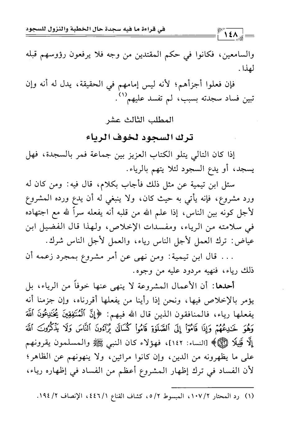 المطلب الثالث عشر: ترك السجود لخوف الرياء