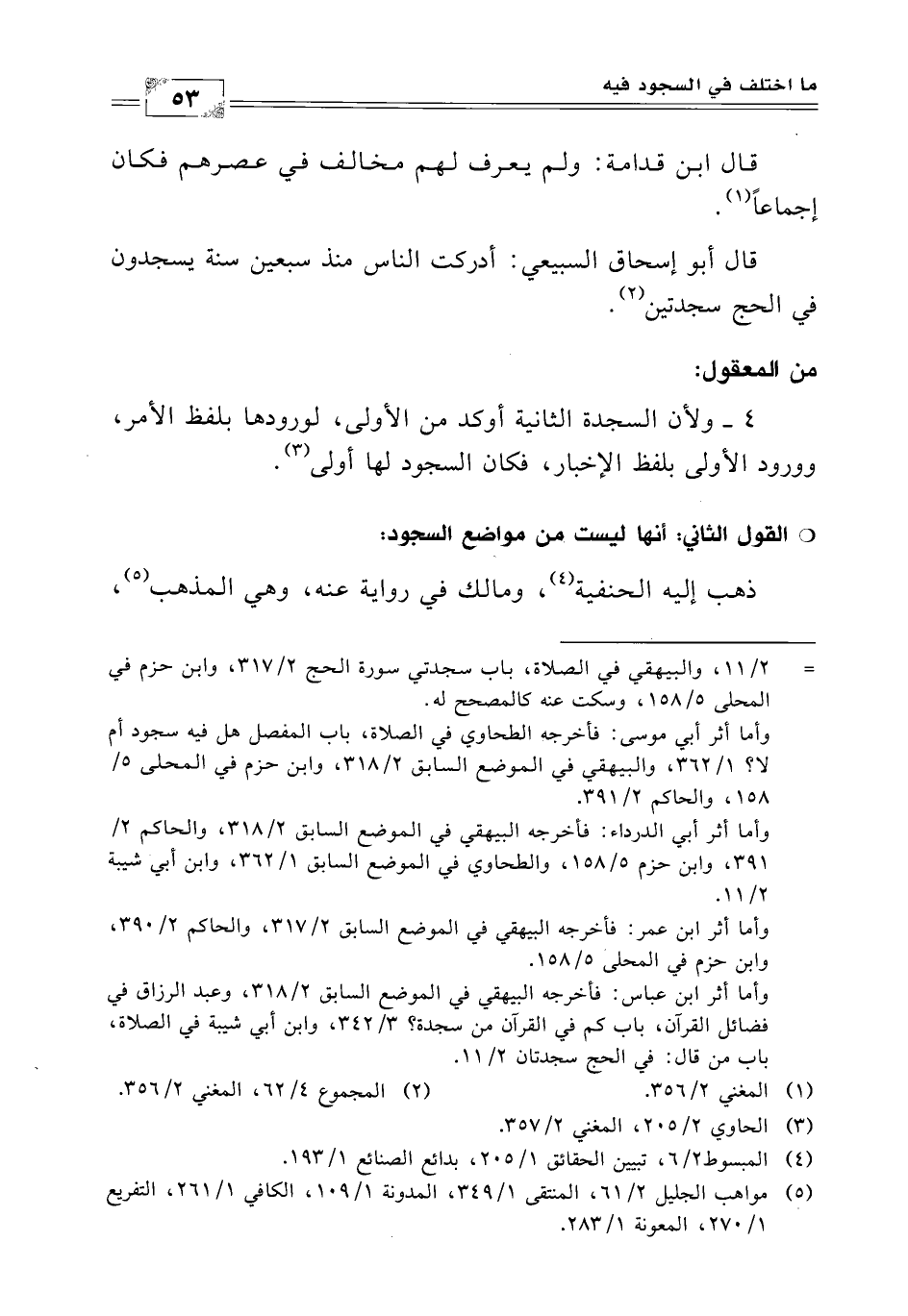4 - ولأن السجدة الثانية أوكد من الأولى، لورودها بلفظ الأمر، وورود الأولى بلفظ الإخبار، فكان السجود لها أولى (¬3).