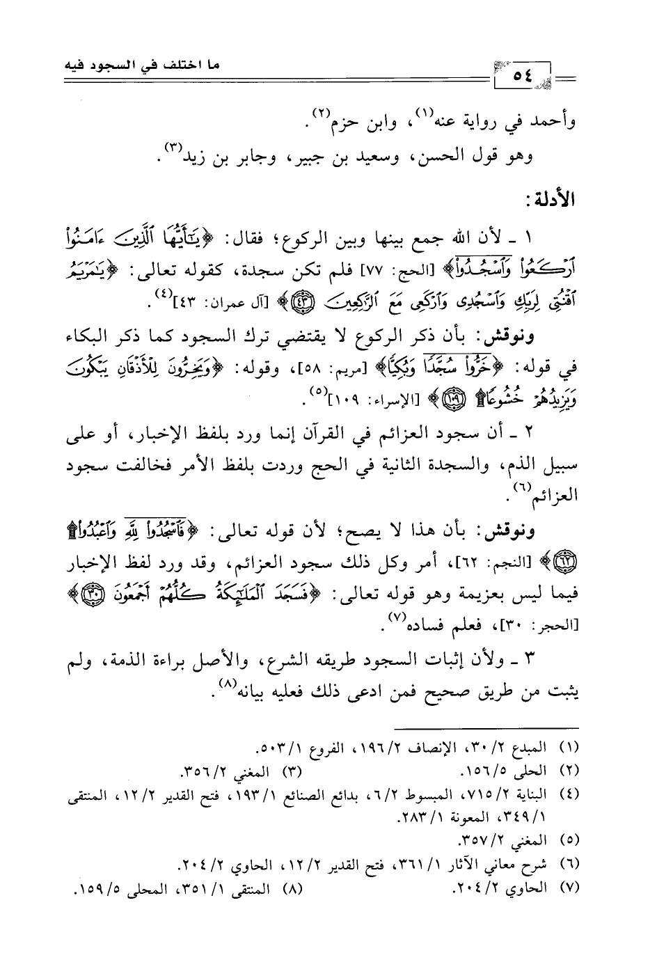 2 - أن سجود العزائم في القرآن إنما ورد بلفظ الإخبار، أو على سبيل الذم، والسجدة الثانية في الحج وردت بلفظ الأمر فخالفت سجود العزائم (¬6).