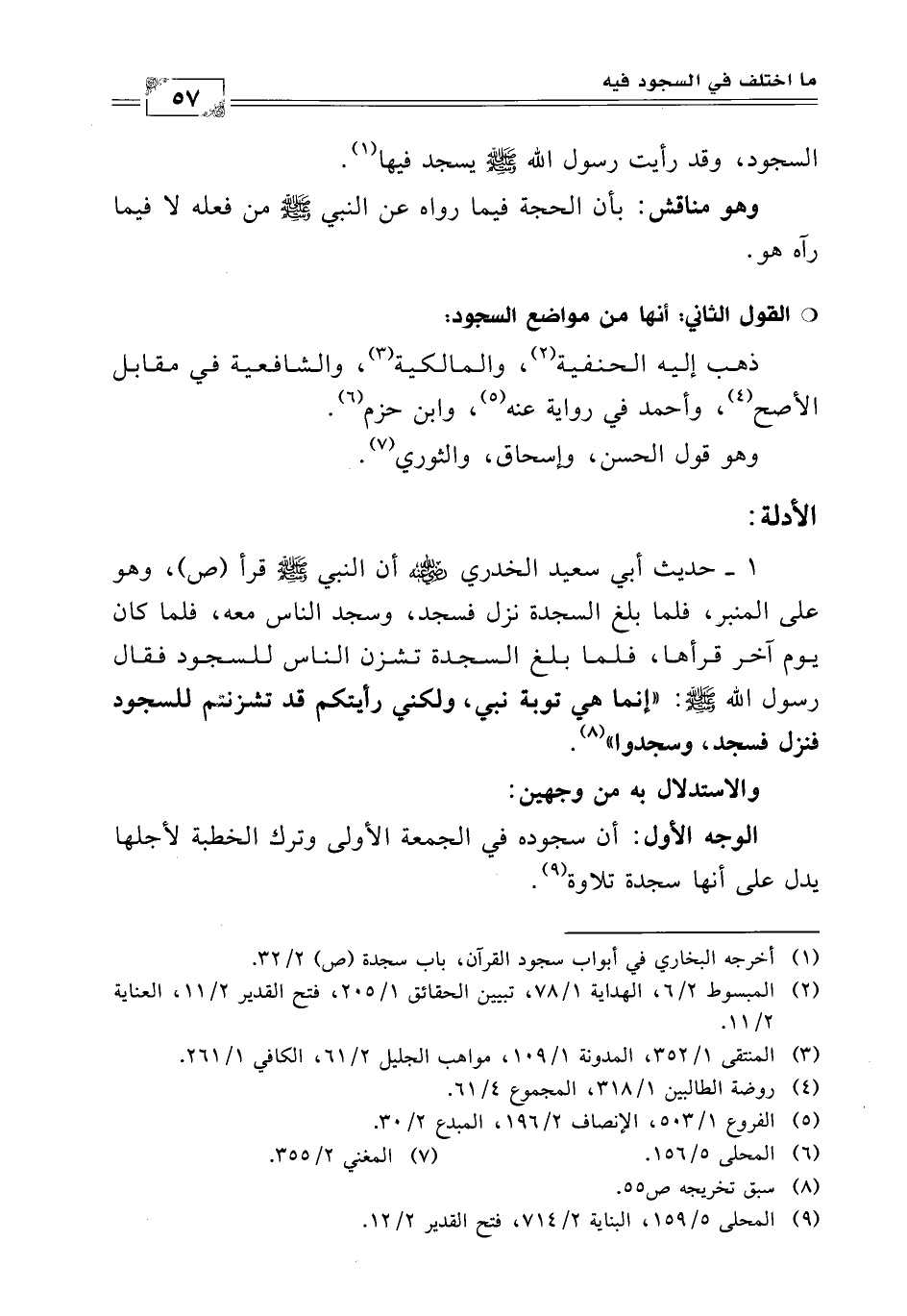 الوجه الأول: أن سجوده في الجمعة الأولى وترك الخطبة لأجلها يدل على أنها سجدة تلاوة (¬9).