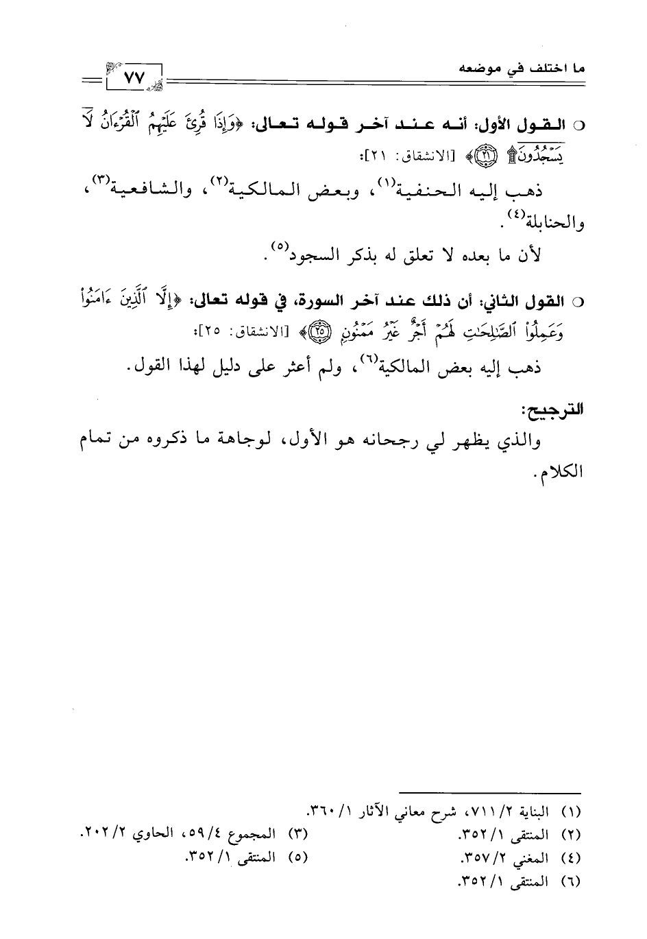 القول الأول: أنه عند آخر قوله تعالى: {وَإِذَا قُرِئَ عَلَيْهِمُ الْقُرْآنُ لَا يَسْجُدُونَ} [الانشقاق: 21].