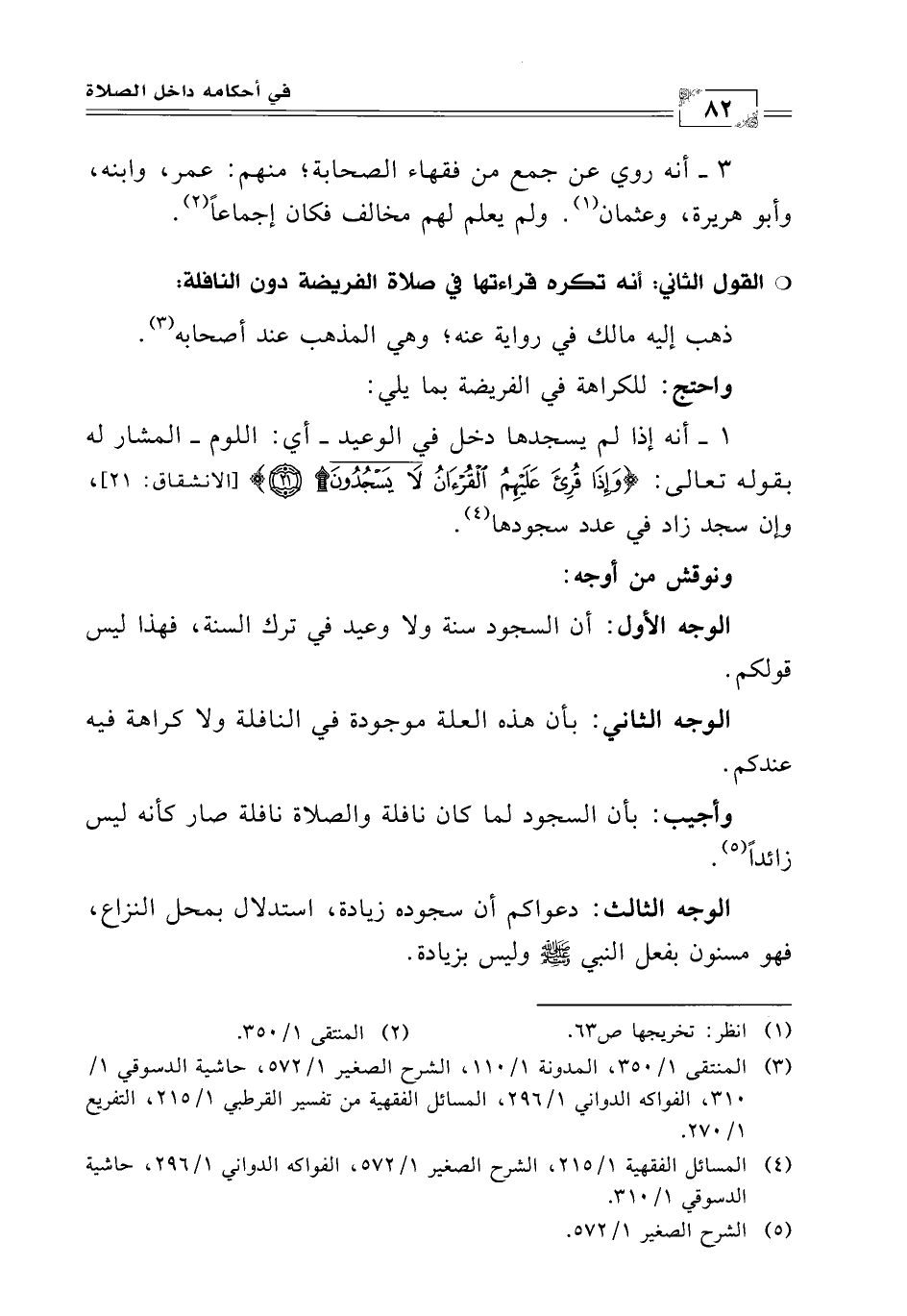 1 - أنه إذا لم يسجدها دخل في الوعيد، أي: اللوم المشار له بقوله تعالى: ... {وَإِذَا قُرِئَ عَلَيْهِمُ الْقُرْآنُ لَا يَسْجُدُونَ} [الانشقاق: 21] وإن سجد زاد في عدد سجودها (¬4).
