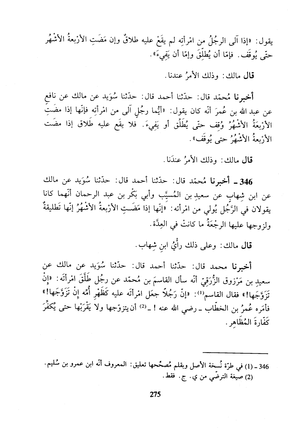 346- أخبرنا محمد قال: حدثنا أحمد قال: حدثنا سويد عن مالك عن ابن شهاب عن سعيد بن المسيب وأبي بكر بن عبد الرحمان أنهما كانا يقولان في الرجل يولي من امرأته: ((إنها إذا مضت الأربعة الأشهر إنها تطليقةٌ ولزوجها عليها الرجعة ما كانت في العدة.