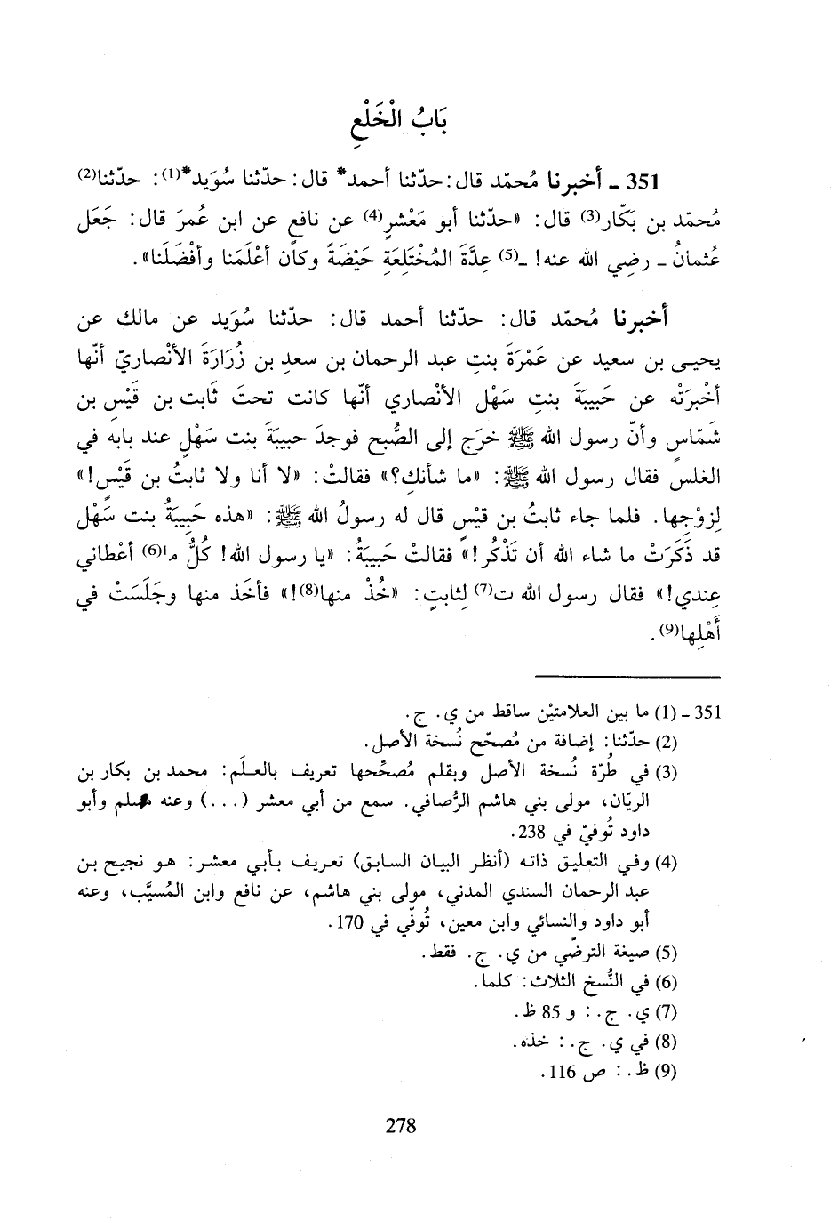 أخبرنا محمد قال: حدثنا أحمد قال: حدثنا سويد عن مالك عن يحيى بن سعيد عن عمرة بنت عبد الرحمان بن سعد بن زرارة الأنصاري أنها أخبرته عن حبيبة بنت سهل الأنصاري أنها كانت تحت ثابت بن قيس بن شماس وأن رسول الله صلى الله عليه وسلم خرج إلى الصبح فوجد حبيبة بنت سهلٍ عند بابه في الغلس فقال رسول الله صلى الله عليه وسلم: ((ما شأنك؟)) فقالت: ((لا أنا ولا ثابت بن قيس!)) لزوجها. فلما جاء ثابت بن قيس قال له رسول الله صلى الله عليه وسلم: ((هذه حبيبة بنت سهل قد ذكرت ما شاء الله أن تذكر!)) فقالت حبيبة: ((يا رسول الله! كل ما أعطاني عندي!)) فقال رسول الله ت لثابتٍ: ((خذ منها!)) فأخذ منها وجلست في أهلها.