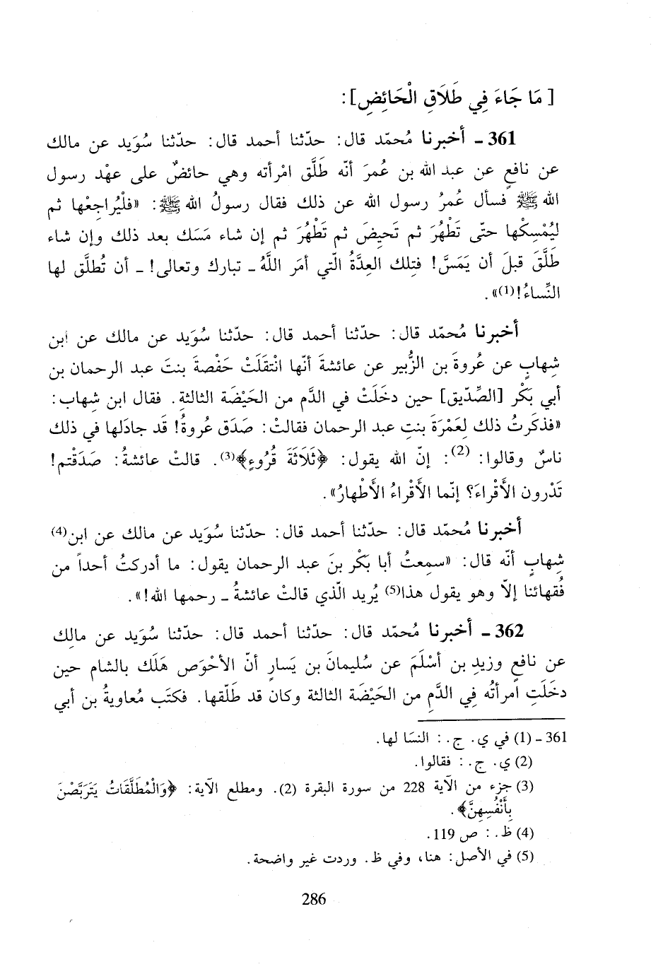 أخبرنا محمد قال: حدثنا أحمد قال: حدثنا سويد عن مالك عن ابن شهابٍ عن عروة بن الزبير عن عائشة أنها انتقلت حفصة بنت عبد الرحمان بن أبي بكر [الصديق] حين دخلت في الدم من الحيضة الثالثة. فقال ابن شهاب: ((فذكرت ذلك لعمرة بنت عبد الرحمن فقالت: صدق عروة! قد جادلها في ذلك ناسٌ وقالوا: إن الله يقول: {ثلاثة قروءٍ}. قالت عائشة: صدقتم! تدرون الأقراء؟ إنما الأقراء الأطهار)).