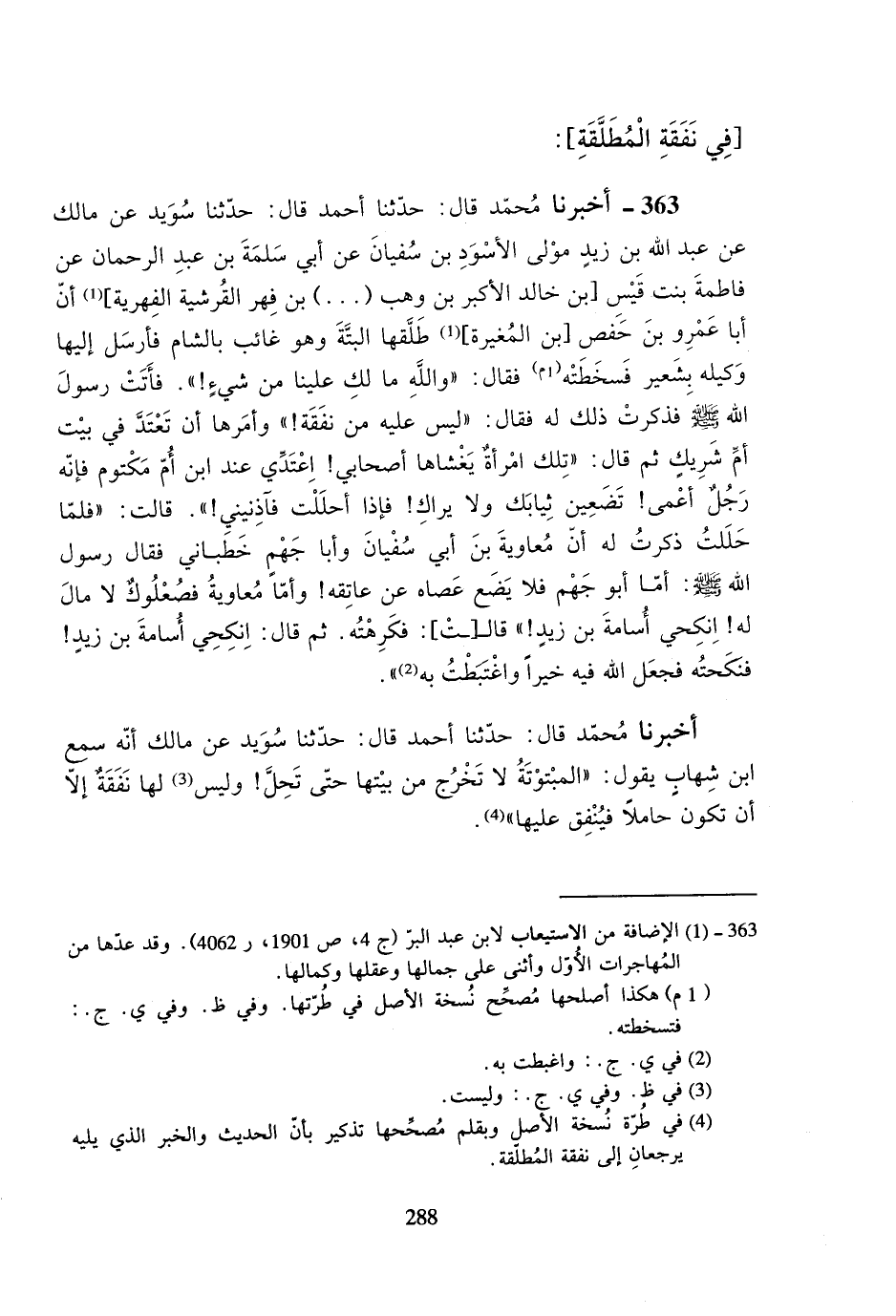 363- أخبرنا محمد قال: حدثنا أحمد قال: حدثنا سويد عن مالك عن عبد الله بن زيدٍ مولى الأسود بن سفيان عن أبي سلمة بن عبد الرحمان عن فاطمة بنت قيس [بن خالد الأكبر بن وهب ( .. .. ) بن فهر القرشية الفهرية] أن أبا عمرو بن حفص [بن المغيرة] طلقها البتة وهو غائب بالشام فأرسل إليها وكيله بشعير فسخطته فقال: ((والله ما لك علينا من شيءٍ!)). فأتت رسول الله صلى الله عليه وسلم فذكرت ذلك له فقال: ((ليس عليه من نفقة!)) وأمرها أن تعتد في بيت أم شريك ثم قال: ((تلك امرأةٌ يغشاها أصحابي! اعتدي عند ابن أم مكتوم فإنه رجلٌ أعمى! تضعين ثيابك ولا يراك! فإذا أحللت فآذنيني!)). قالت: ((فلما حللت ذكرت له أن معاوية بن أبي سفيان وأبا جهم خطباني فقال رسول الله صلى الله عليه وسلم: ((أما أبو جهم فلا يضع عصاه عن عاتقه! وأما معاوية فصعلوكٌ لا مال له! انكحي أسامة بن زيد!)) قالـ[ـت]: فكرهته. ثم قال: انكحي أسامة بن زيدٍ! فنكحته فجعل الله فيه خيراً واغتبطت به)).