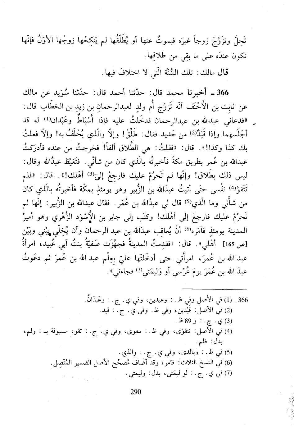 366- أخبرنا محمد قال: حدثنا أحمد قال: حدثنا سويد عن مالك عن ثابت بن الأحنف أنه تزوج أم ولدٍ لعبد الرحمان بن زيدٍ بن الخطاب قال: ((فدعاني عبد الله بن عبد الرحمان فدخلت عليه فإذا أسياطٌ وعبدان له قد أجلسهما وإذا قيدٌ من حديد فقال: طلق! وإلا والذي يحلف به! وإلا فعلت بك كذا وكذا!)). قال: ((فقلت: هي الطلاق ألفاً! فخرجت من عنده فأدركت عبد الله بن عمر بطريق مكة فأخبرته بالذي كان من شأني. فتغيظ عبد الله وقال: ليس ذلك بطلاق! وإنها لم تحرم عليك فارجع إلى أهلك!)). قال: ((فلم تتقو نفسي حتى أتيت عبد الله بن الزبير وهو يومئذٍ بمكة فأخبرته بالذي كان من شأني وما الذي قال لي عبد الله بن عمر. فقال عبد الله بن الزبير: إنها لم تحرم عليك فارجع إلى أهلك! وكتب إلى جابر بن الأسود الزهري وهو أمير المدينة يومئذٍ فأمره أن يعاقب عبد الله بن عبد الرحمان وأن يخلي بيني وبين أهلي)). قال: ((فقدمت المدينة فجهزت صفية بنت أبي عبيد، امرأة عبد الله بن عمر، امرأتي حتى أدخلتها علي بعلم عبد الله بن عمر ثم دعوت عبد الله بن عمر يوم عرسي أو وليمتي فجاءني)).