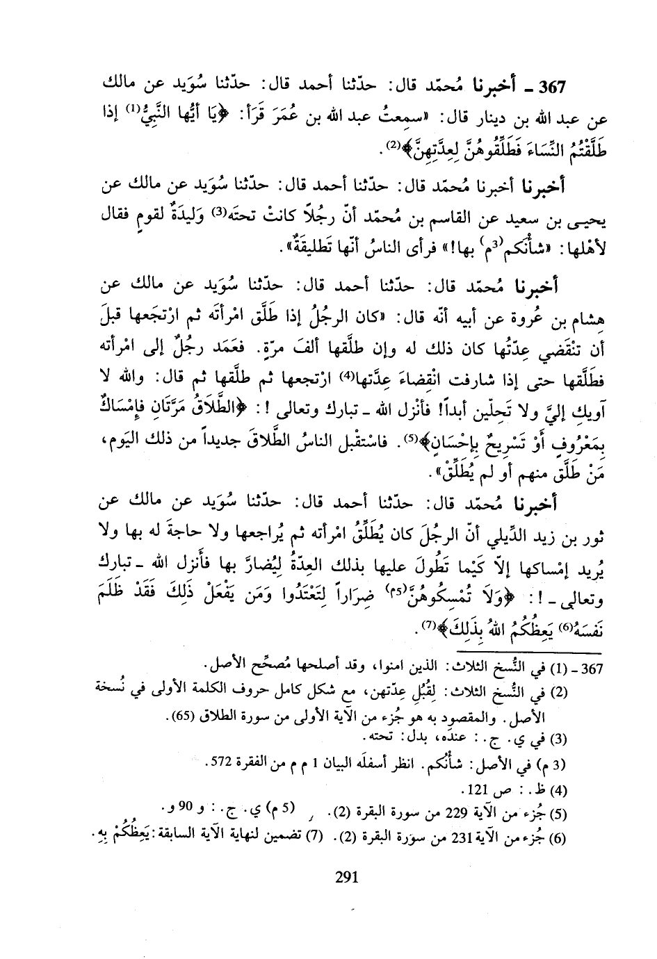 367- أخبرنا محمد قال: حدثنا أحمد قال: حدثنا سويد عن مالك عن عبد الله بن دينار قال: ((سمعت عبد الله بن عمر قرأ: {يا أيها النبي إذا طلقتم النساء فطلقوهن لعدتهن}.