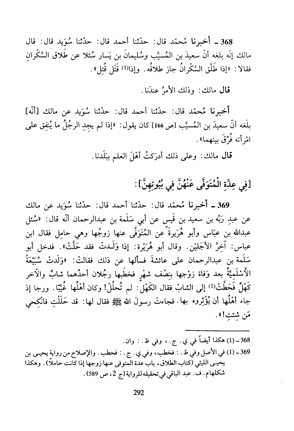 368- أخبرنا محمد قال: حدثنا أحمد قال: حدثنا سويد قال: قال مالك إنه بلغه أن سعيد بن المسيب وسليمان بن يسار سئلا عن طلاق السكران فقالا: ((إذا طلق السكران جاز طلاقه. وإذا قتل قتل)).