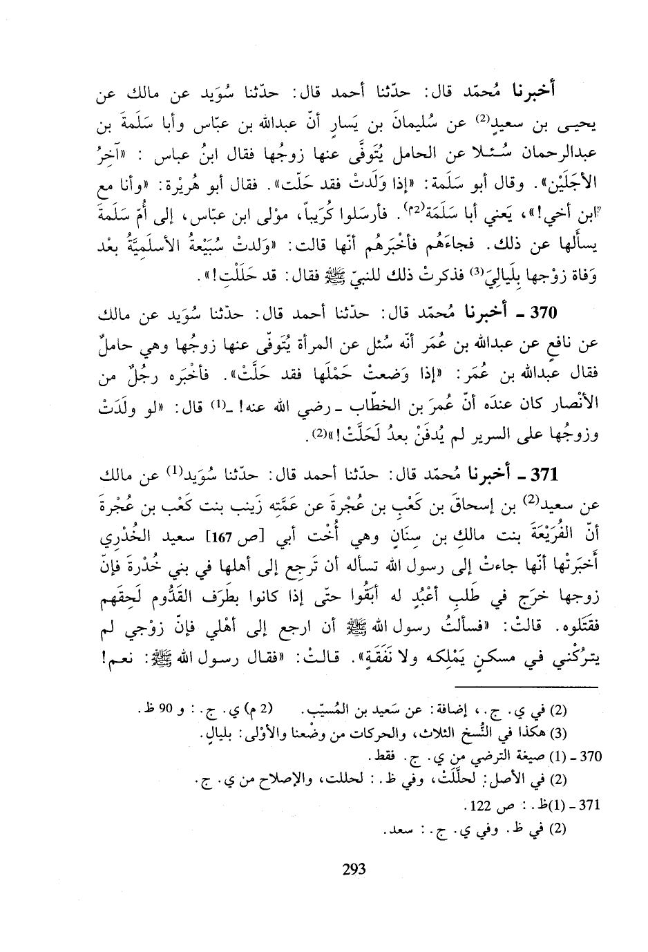 370- أخبرنا محمد قال: حدثنا أحمد قال: حدثنا سويد عن مالك عن نافعٍ عن عبد الله بن عمر أنه سئل عن المرأة يتوفى عنها زوجها وهي حاملٌ فقال عبد الله بن عمر: ((إذا وضعت حملها فقد حلت)). فأخبره رجلٌ من الأنصار كان عنده أن عمر بن الخطاب -رضي الله عنه!- قال: ((لو ولدت وزوجها على السرير لم يدفن بعد لحلت!)).