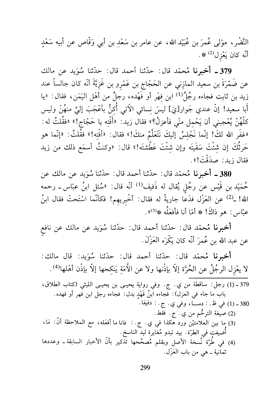 379- أخبرنا محمد قال: حدثنا أحمد قال: حدثنا سويد عن مالك عن ضمرة بن سعيد المازني عن الحجاج بن عمرو بن غزية أنه كان جالساً عند زيد بن ثابت فجاءه رجلٌ ابن فهر أو فهده، رجلٌ من أهل اليمن، فقال: ((يا أبا سعيد! إن عندي جوار[ي] ليس نسائي الآتي أكن بأعجب إلي منهن وليس كلهن يعجبني أن يحمل مني فأعزل؟)) فقال زيد: ((أفته يا حجاج!)) فقلت له: ((غفر الله لكّ إنما نجلس إليك نتعلم منك!)) فقال: ((أفته!)) فقلت: ((إنما هو حرثك إن شئت سقيته وإن شئت عطشته!)) قال: ((وكنت أسمع ذلك من زيد فقال زيد: صدقت!)).