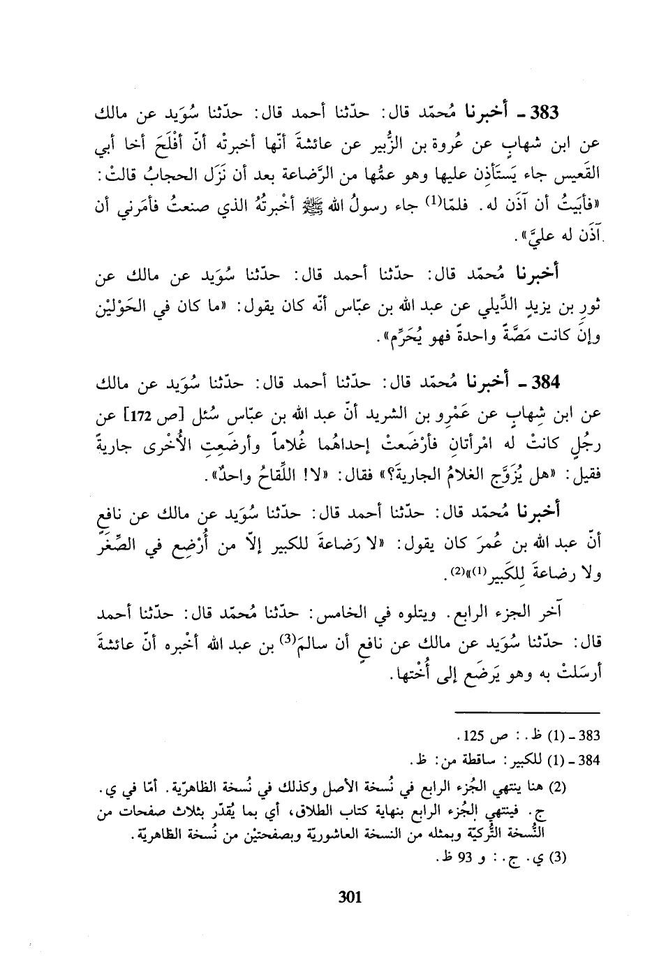 آخر الجزء الرابع. ويتلوه في الخامس: حدثنا محمد قال: حدثنا أحمد قال: حدثنا سويد عن مالك عن نافع أن سالم بن عبد الله أخبره أن عائشة أرسلت به وهو يرضع إلى أختها.