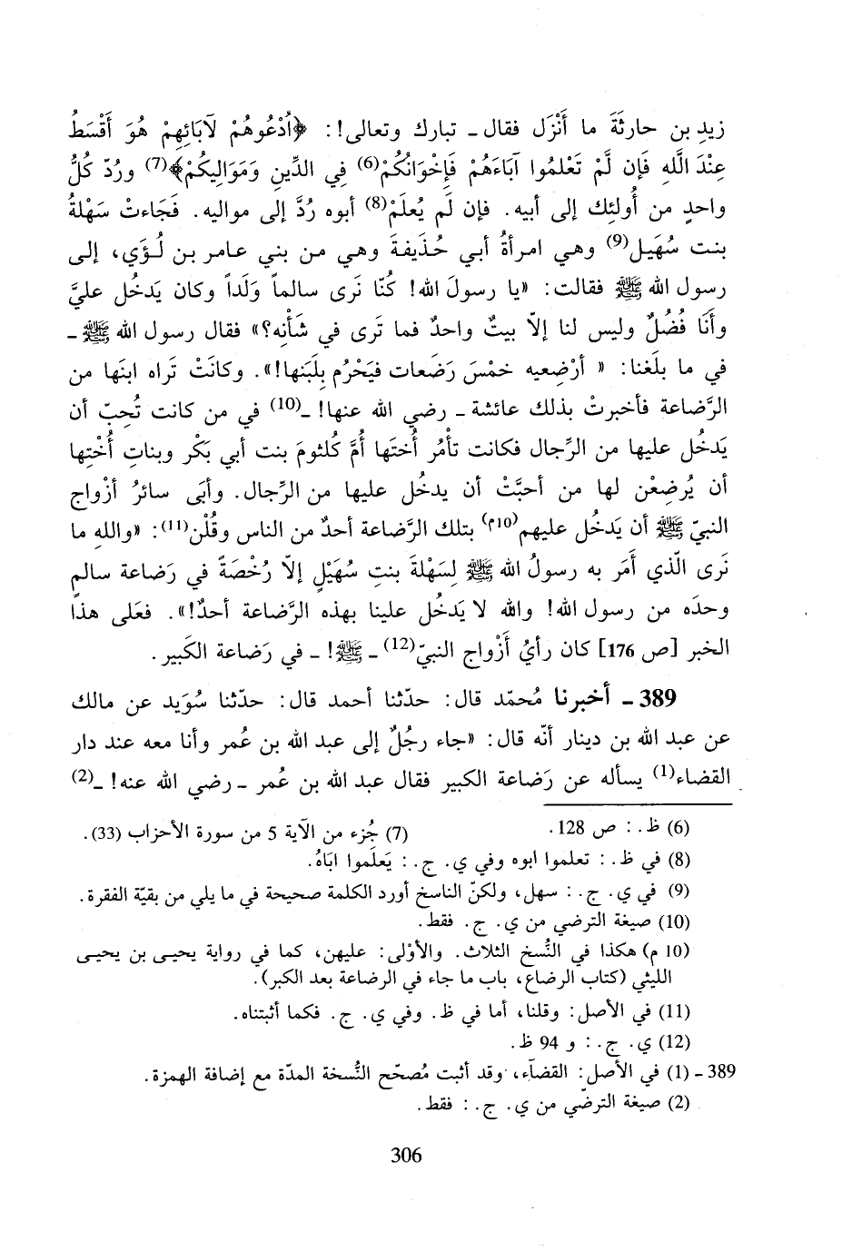 389- أخبرنا محمد قال: حدثنا أحمد قال: حدثنا سويد عن مالك عن عبد الله بن دينار أنه قال: ((جاء رجلٌ إلى عبد الله بن عمر وأنا معه عند دار القضاء يسأله عن رضاعة الكبير فقال عبد الله بن عمر -رضي الله عنه!- #307# جاء رجلٌ إلى عمر بن الخطاب: فقال: إني كانت لي وليدةٌ وكنت أطؤها فعمدت امرأتي إليها فأرضعتها فقال عمر: أوجعها وائت جاريتك فإنما الرضاع رضاعة الصغير!)).
