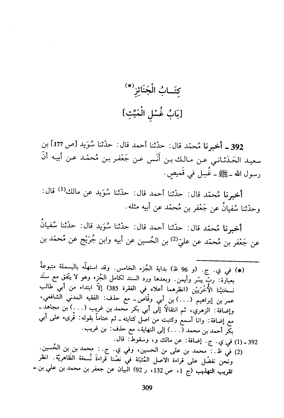392- أخبرنا محمد قال: حدثنا أحمد قال: حدثنا سويد بن سعيد الحدثاني عن مالك بن أنس عن جعفر بن محمد عن أبيه أن رسول الله -صلى الله عليه وسلم- غسل في قميصٍ.