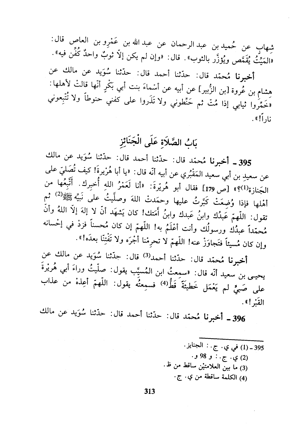 395- أخبرنا محمد قال: حدثنا أحمد قال: حدثنا سويد عن مالك عن سعيد بن أبي سعيد المقبري عن أبيه أنه قال: ((يا أبا هريرة! كيف تصلي على الجنازة؟)) فقال أبو هريرة: ((أنا لعمر الله أخبرك. أتبعها من أهلها فإذا وضعت كبرت عليها وحمدت الله وصليت على نبيه صلى الله عليه وسلم ثم تقول: اللهم عبدك وابن عبدك وابن أمتك! كان يشهد أن لا إله إلا الله وأن محمداً عبدك ورسولك وأنت أعلم به! اللهم إن كان محسناً فزد في إحسانه وإن كان مسيئاً فتجاوز عنه! اللهم لا تحرمنا أجره ولا تفتنا بعده!)).