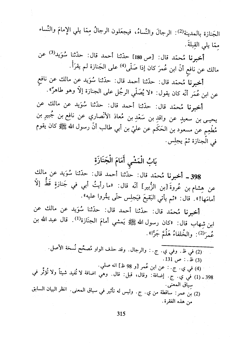 398- أخبرنا محمد قال: حدثنا أحمد قال: حدثنا سويد عن مالك عن هشامٍ بن عروة [بن الزبير] أنه قال: ((ما رأيت أبي في جنازةٍ قط إلا أمامها!)). قال: ((ثم يأتي البقيع فيجلس حتى يمروا عليه)).