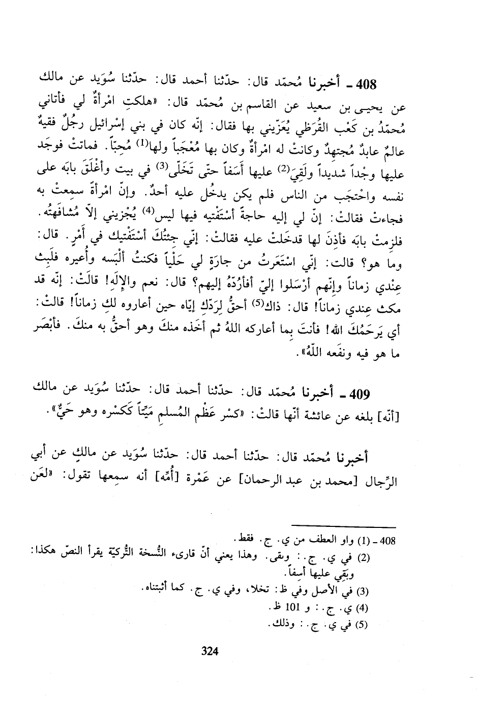 409- أخبرنا محمد قال: حدثنا أحمد قال: حدثنا سويد عن مالك [أنه] بلغه عن عائشة أنها قالت: ((كسر عظم المسلم ميتاً ككسره وهو حي)).