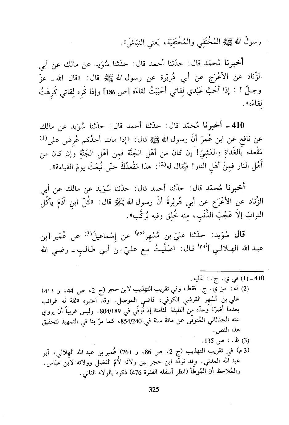 410- أخبرنا محمد قال: حدثنا أحمد قال: حدثنا سويد عن مالك عن نافع عن ابن عمر أن رسول الله صلى الله عليه وسلم قال: ((إذا مات أحدكم عرض على مقعده بالغداة والعشي! إن كان من أهل الجنة فمن أهل الجنة وإن كان من أهل النار فمن أهل النار! فيقال له: هذا مقعدك حتى تبعث يوم القيامة)).