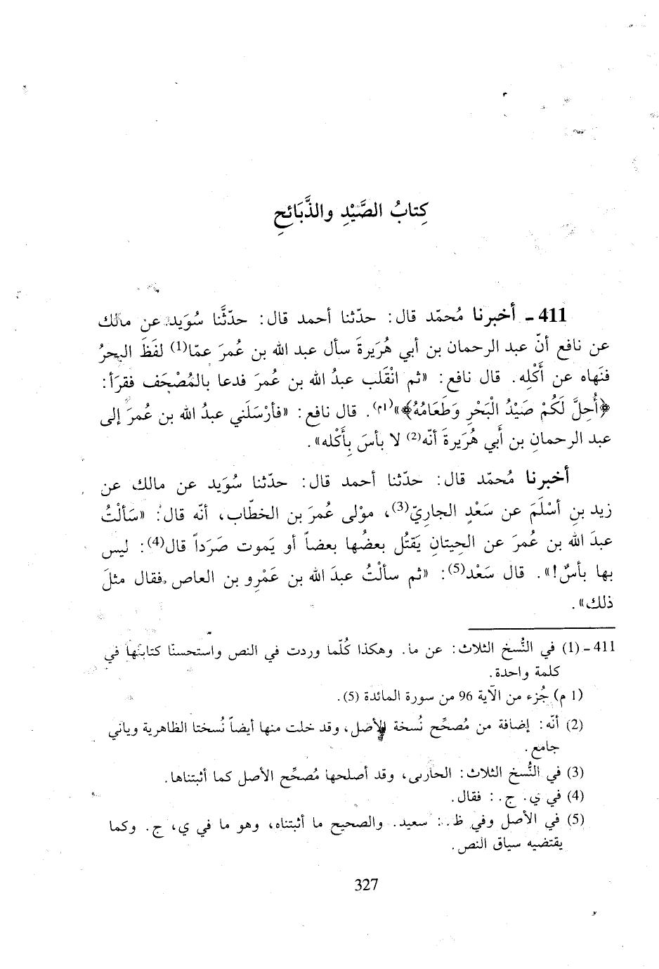 411- أخبرنا محمد قال: حدثنا أحمد قال: حدثنا سويد عن مالك عن نافع أن عبد الرحمان بن أبي هريرة سأل عبد الله بن عمر عما لفظ البحر فنهاه عن أكله. قال نافع: ((ثم انقلب عبد الله بن عمر فدعا بالمصحف فقرأ: {أحل لكم صيد البحر وطعامه}. قال نافع: ((فأرسلني عبد الله بن عمر إلى عبد الرحمان بن أبي هريرة أنه لا بأس بأكله)).