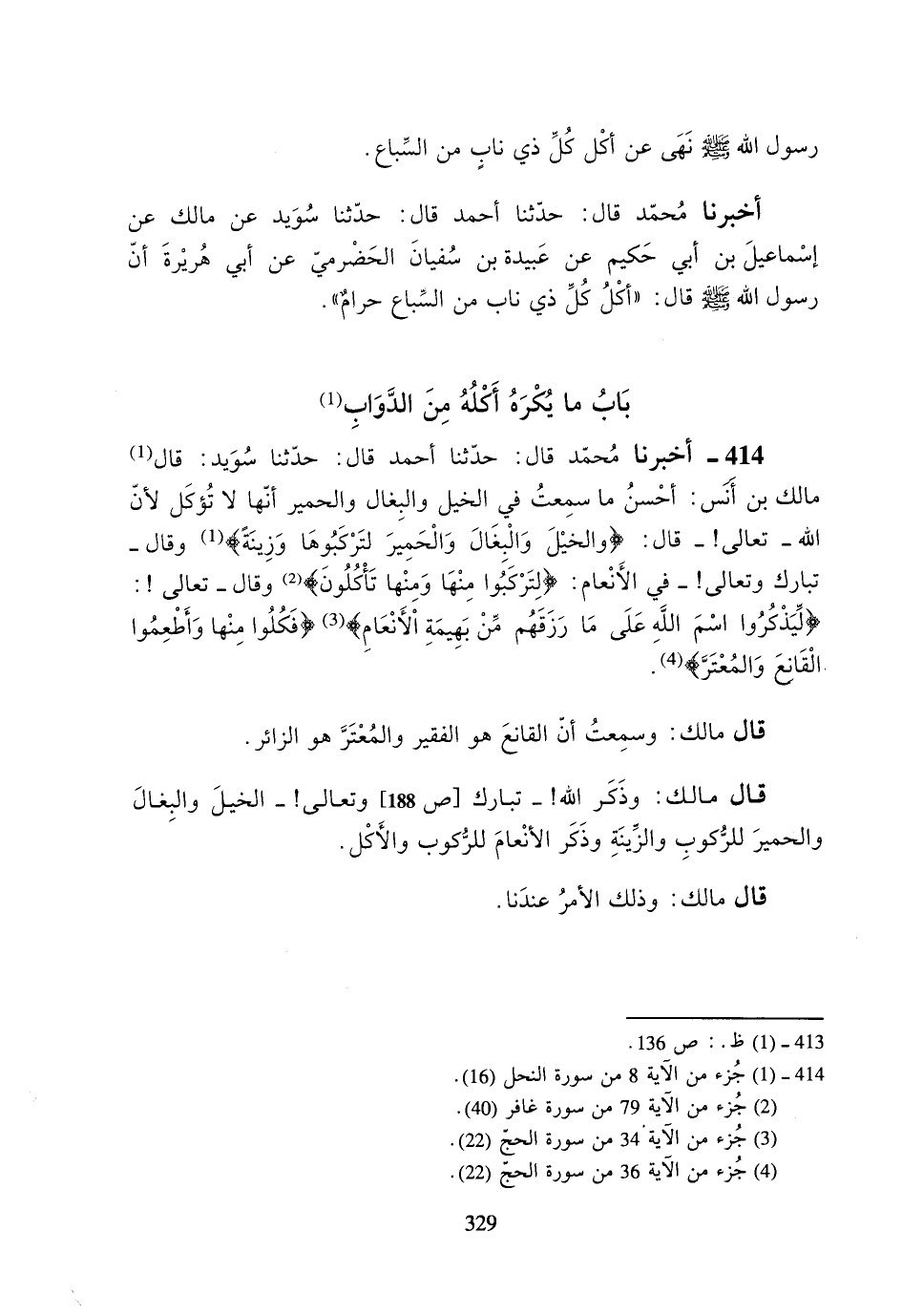 414- أخبرنا محمد قال: حدثنا أحمد قال: حدثنا سويد: قال مالك بن أنس: أحسن ما سمعت في الخيل والبغال والحمير أنها لا تؤكل لأن الله -تعالى!- قال: {والخيل والبغال والحمير لتركبوها وزينةً} وقال -تبارك وتعالى!- في الأنعام: {لتركبوا منها ومنها تأكلون} وقال تعالى!-: {ليذكروا اسم الله على ما رزقهم من بهيمة الأنعام} {فكلوا منها وأطعموا القانع والمعتر}.